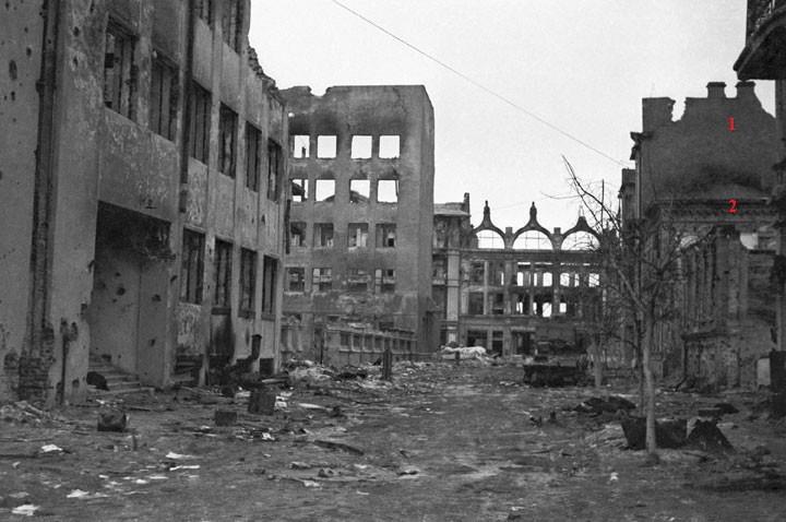Теперь обращаемся к фотографии 1943 года сделанной с обратной стороны - красными цифрами 1 и 2 помечены, сравнительно уцелевшие после Сталинградской Битвы, дома по Пролеткультской 3(четырёхэтажка) и 5 (двухэтажка):