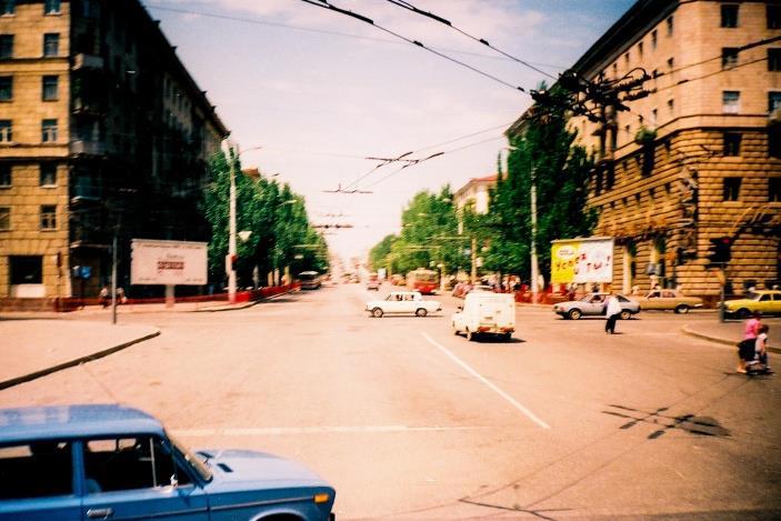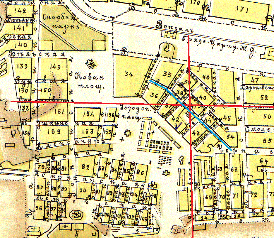 Красными линиями намечены разрезавшие её в конце сороковых годов улицы Мира (по горизонтали) и Комсомольская (по вертикали), а сама - синей. Очевидно, что она, если бы продолжала существовать в своих довоенных границах, пересекла бы обе красные линии. Проведём теперь синюю линию на панорамном снимке восьмидесятых годов двадцатого века, учитывая и достаточно заметный излом на пересечении с Анастасийской (ныне Волгодонской):