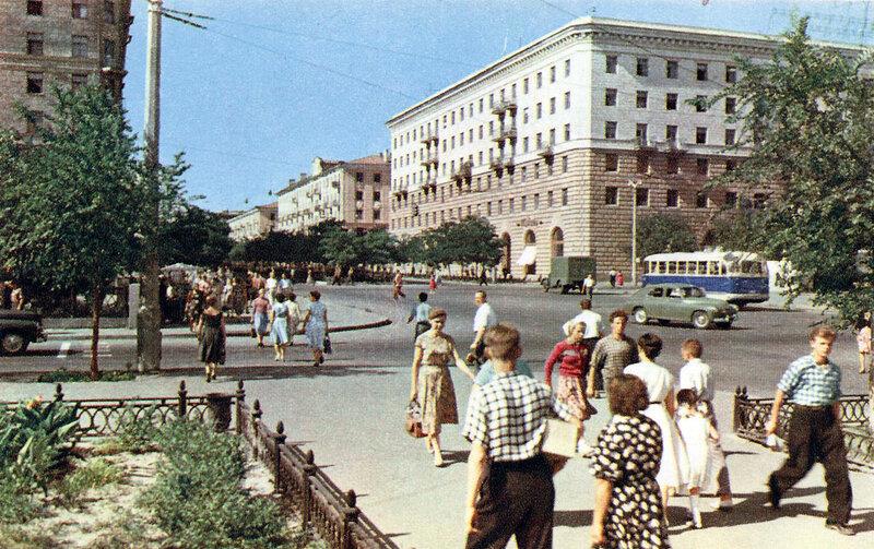 Да, синяя линия действительно пересекает и Мира, и Комсомольскую, но все здания на её пути постройки конца сороковых-пятидесятых годов двадцатого века и к довоенной улице отношения иметь никак не могут. Лишь в самом правом нижнем углу чуть видна красная крыша невысокого (двухэтажного) дома, стоящего как раз именно параллельно синей линии - косо, в духе Преображенского форштадта. На самом деле чуть ниже есть ещё один такой дом. Если кто-то будет в Волгограде и захочет найти эти спрятавшиеся от взора здания, то они находятся во дворе дома, значащегося по улице Комсомольской под номером 10 и известного, как Дом Техники (даже остановка общественного транспорта возле него так называлась), а сейчас в нём находится МФЦ. Его угол виден справа на этих фото 1954, 1961 и 1996 годов: