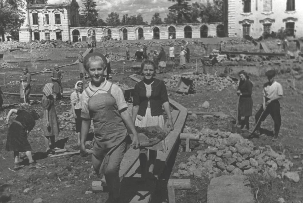 Фонтан "Самсон". На фото подлинная статуя Самсона. Позже, ещё при оккупации, исчезнувшая и так и не найденная. Ныне каскад Большого дворца украшает её копия, созданная скульпторами В. Симоновым и Н. Михайловым в 1947 г. Старую статую, очевидно, немцы переплавили на гильзы.
