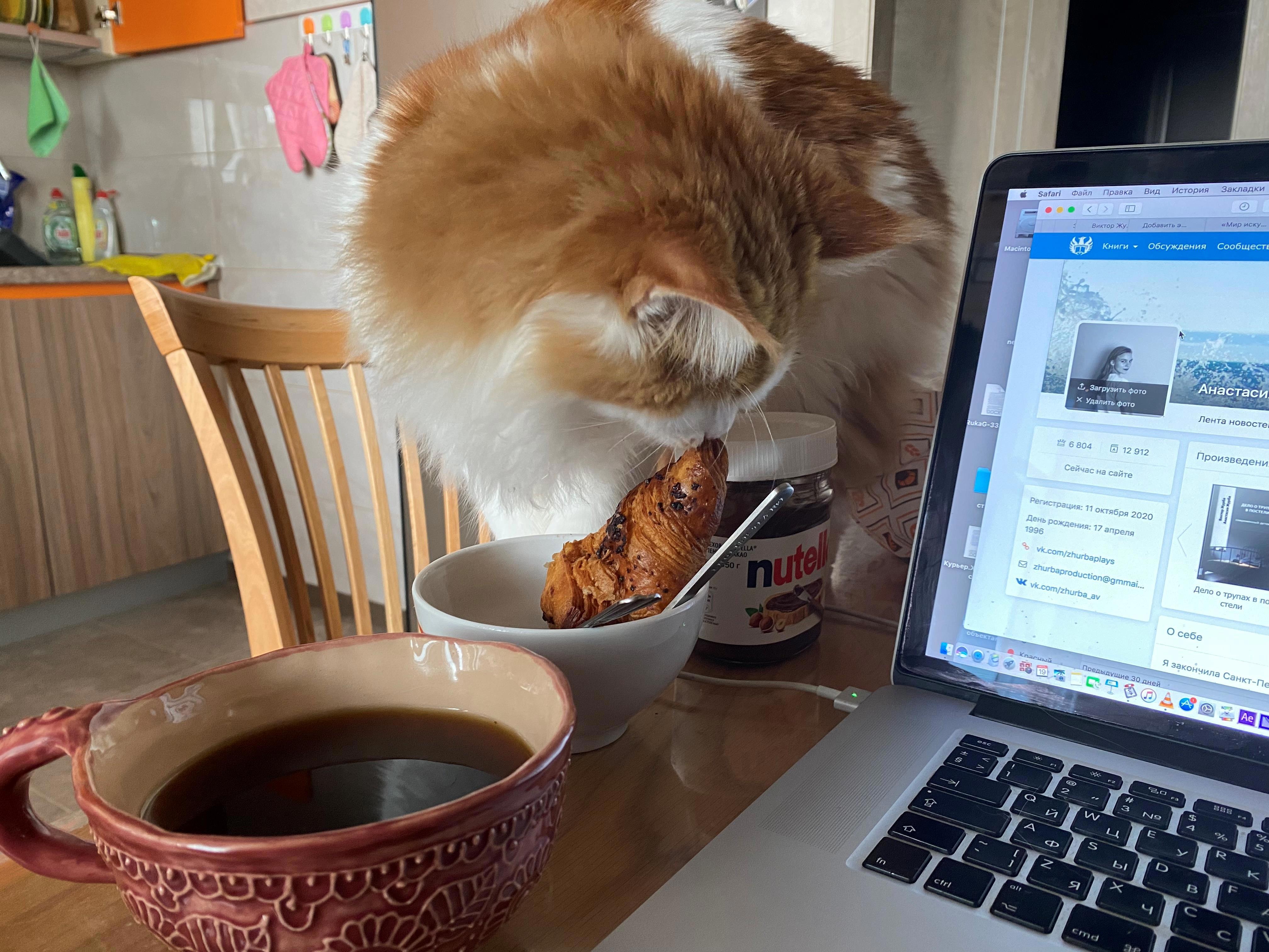 У Кнопы на завтрак шоколадный круассан, кофе, и пару постов с АТ