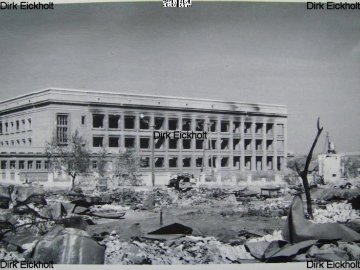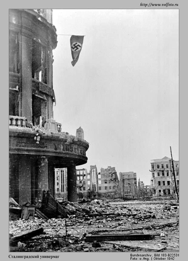 Но всё же вынуждены были отступить к Волге, и зданием Универмага овладел враг - немецкое фото с улицы Островского (с нынешнего "двора Универмага") октября 1942 года - за Универмагом виднеется то, что осталось от "Большой Сталинградской" после бомбардировки 23 августа - по сути, одна стена: