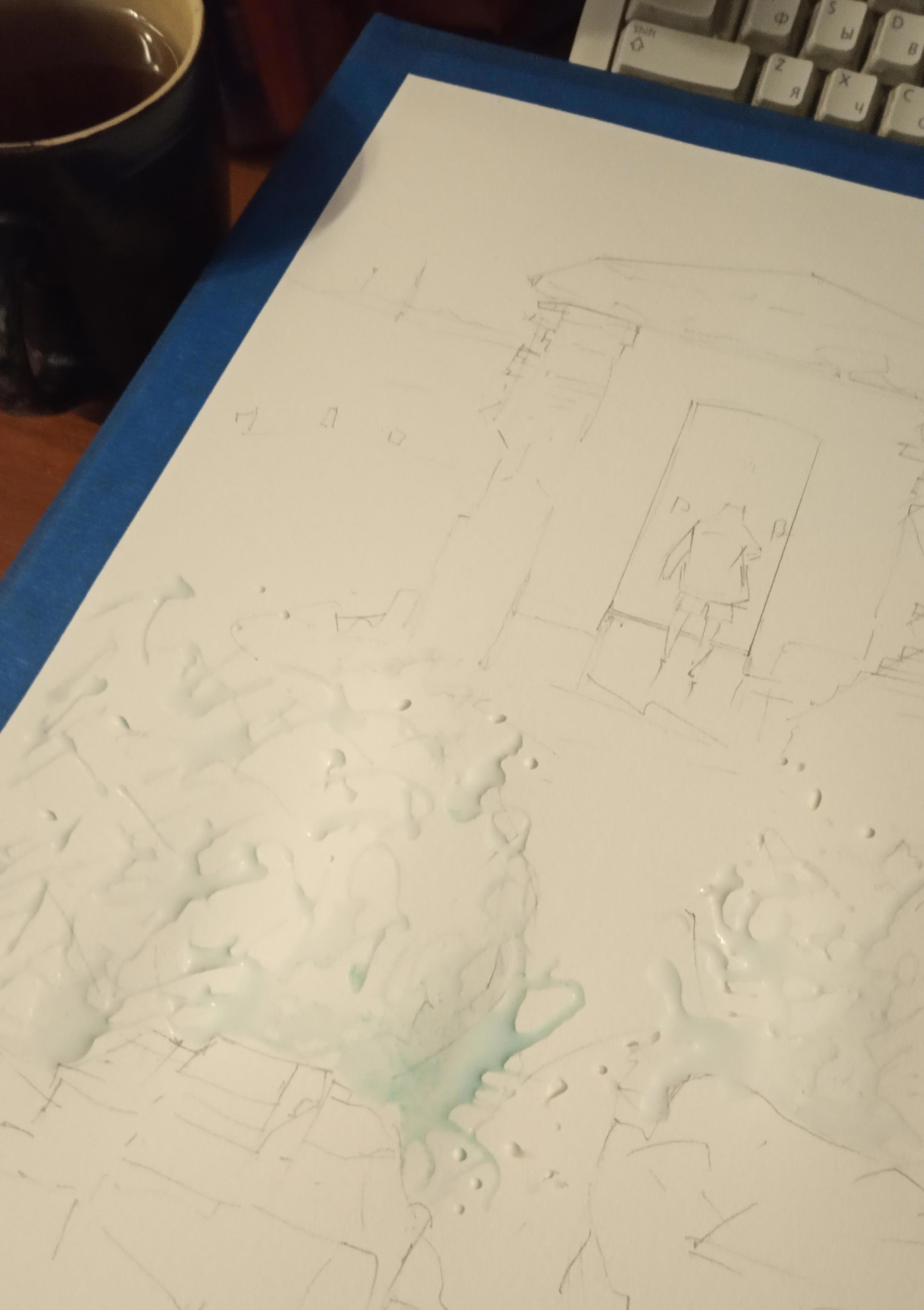 Целиком всё - походным набором акварели VanGogh на 15 полукювет. Отличные краски. Считаются ученическими, как Cotman WN, но при этом существенно насыщенней. Короче, если кто выбирает между ними, выбирайте VanGogh!