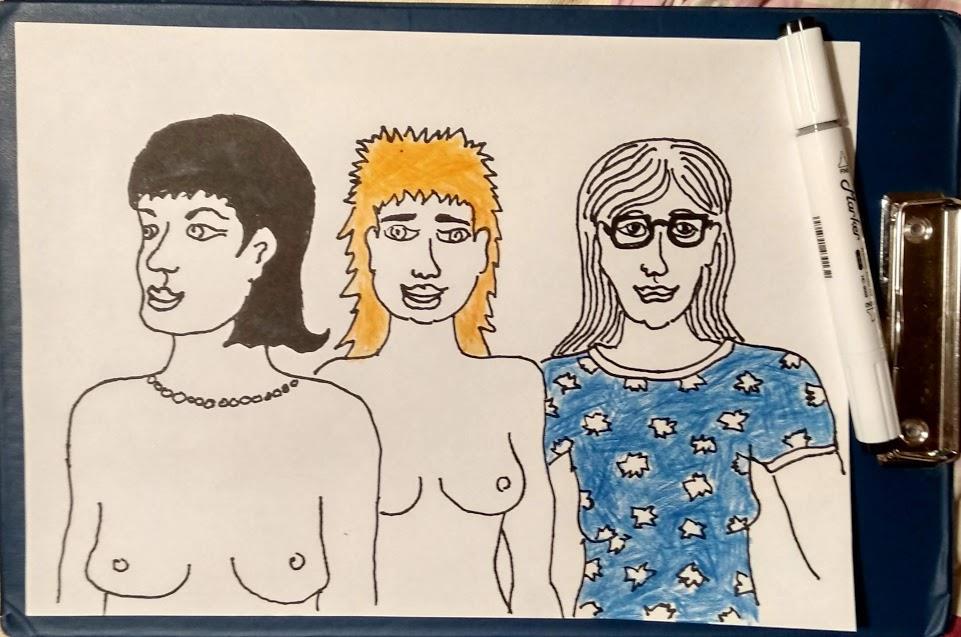 Продолжаю учиться рисовать людей, в частности, женщин. С сиськами немного разобрался. Не смотрите, что там у девушки слева они кривые - это просто был край листа и планшета и у меня рука дрогнула (залился краской от смущения) :)))