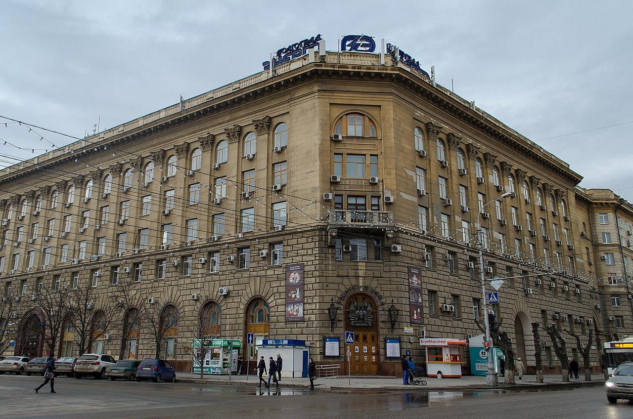 две "палочки-выручалочки" - два великих (не побоюсь этого слова) архитектора: уже упоминавшийся автор улицы Мира Василий Николаевич Симбирцев (1901-1982), бывший в пятидесятых годах главным архитектором Города, и Ефим Иосифович Левитан (1915-2007). Второй, кстати, похоронен на центральном кладбище Города - я всегда отдаю ему дань памяти, когда прихожу на могилы своих близких и прохожу мимо его. Их новый проект, конечно, не копия "Столичных номеров", но новое здание похоже на старую гостиницу и построено полностью на её фундаменте. Больше того, на месте Дома Лётчиков строится второе здание (сначала Совпартшкола, немного позже передано Мединституту) - очень похожее на первое , а на другой стороне Площади Павших Борцов ещё два здания в том же стиле: новое здание гостиницы "Интурист" и здание хорошо известное волгоградцам по нахождению в нём, в том числе, Театра Кукол. "Равновесие" сторон Площади достигнуто почти идеально. Что же за здание стоит на месте "Столичных номеров"? Это вновь гостиница. Сначала она называлась "Сталинград", а затем, как и сам Город, была переименована в "Волгоград".