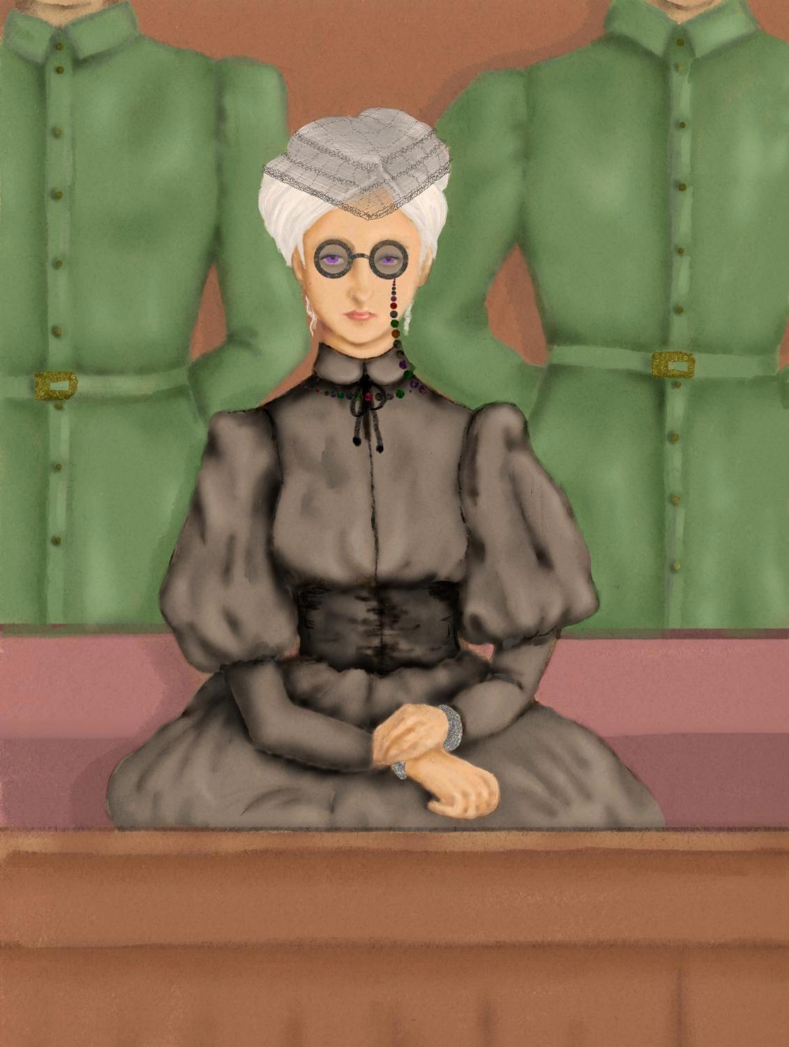 Лассель на этой игре повезло даже больше, чем ее сыну. Наталья Медянская тоже нарисовала матушку в браслетах на суде. И здесь она смотрит на зрителя таким взглядом, что создается впечатление, что это именно она в итоге всех догонит и всем покажет)) Мне очень нравится ее решительный взгляд. Гляда на нее, понимаешь, откуда у Терри такой характер. Унаследовал!