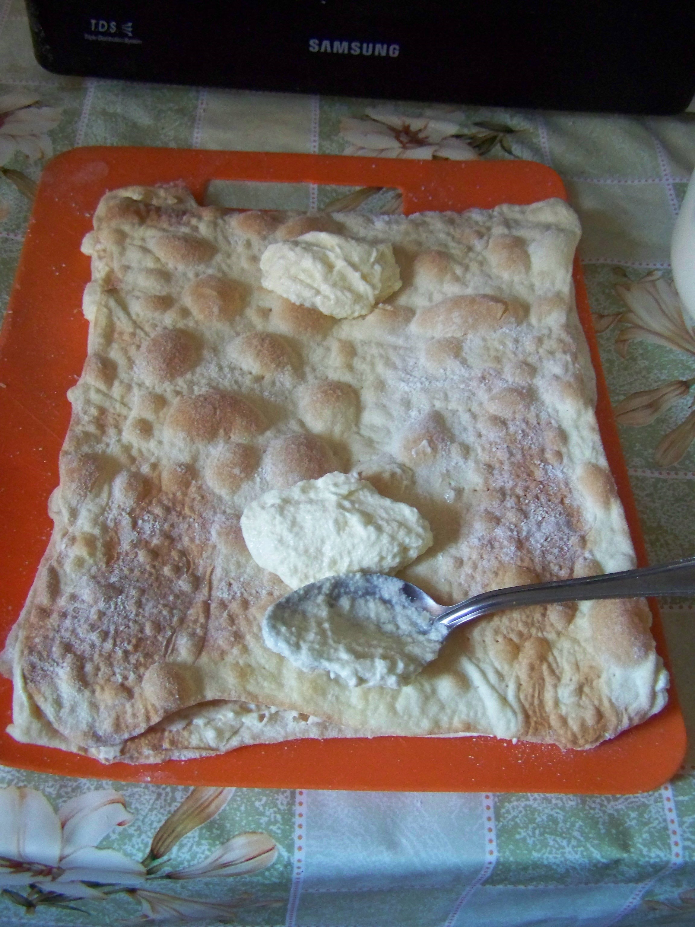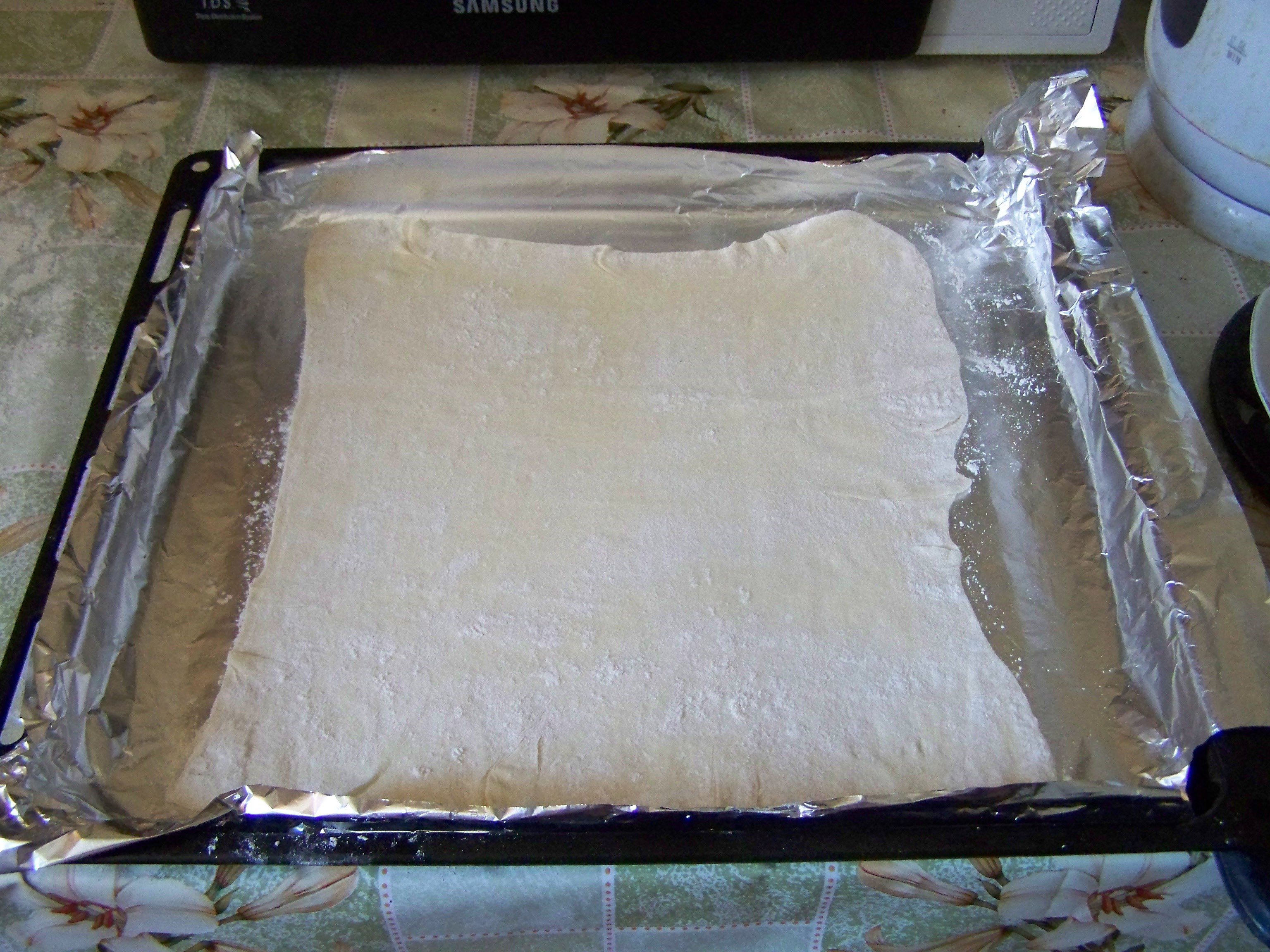 и выкладываю его на посыпанный мукой стол. Сверху также посыпаю мукой (это нужно делать для того, чтобы тесто не прилипало к столу и скалке) и начинаю раскатывать с двух сторон, чтобы получилась тонкая пышка вот такого размера, как показана ниже. Готовую пышку выкладываю на противень, предварительно застеленный фольгой.
