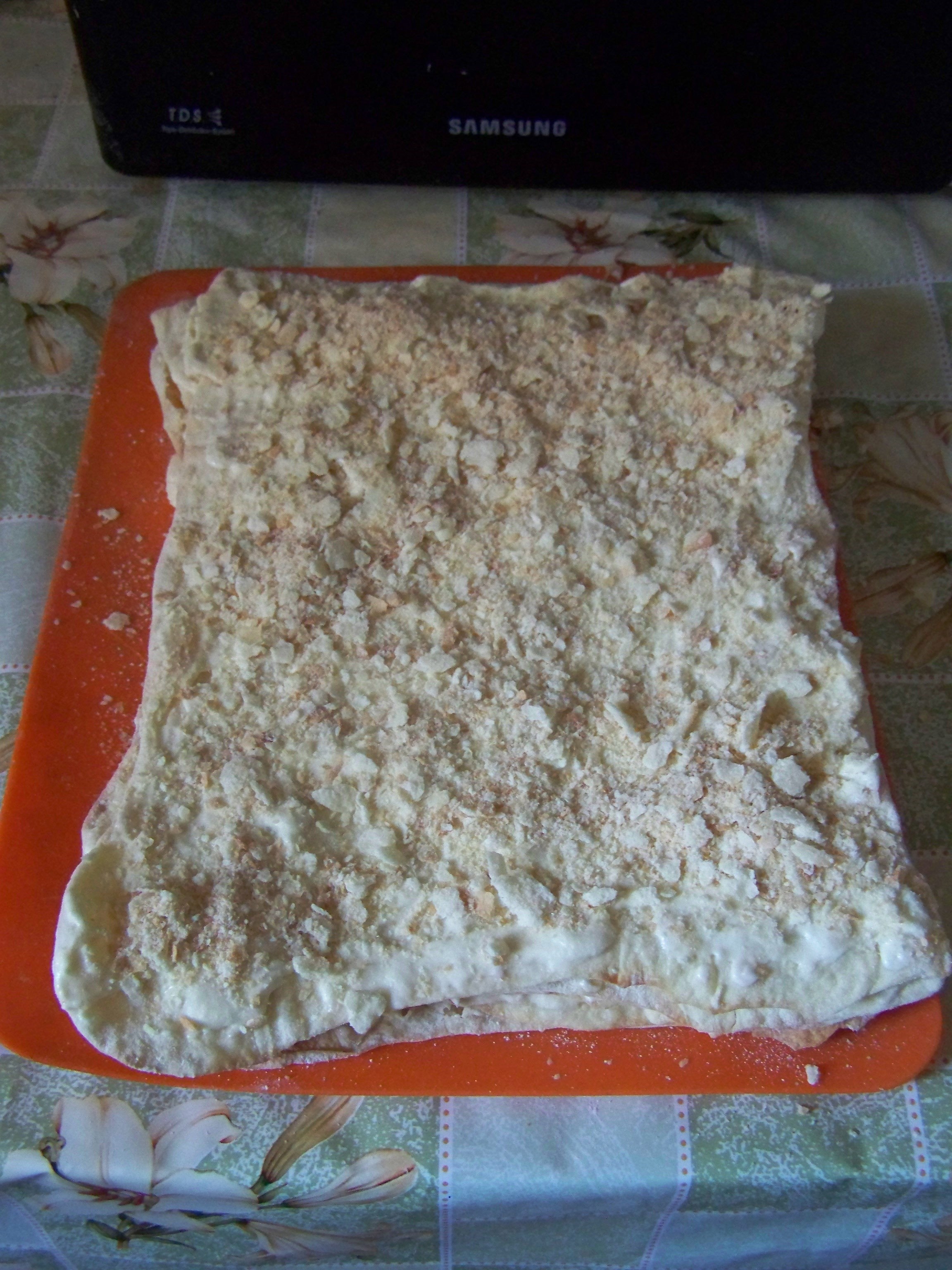Последнюю, верхнюю, пышку посыпаю приготовленной крошкой. Вот и торт готов.