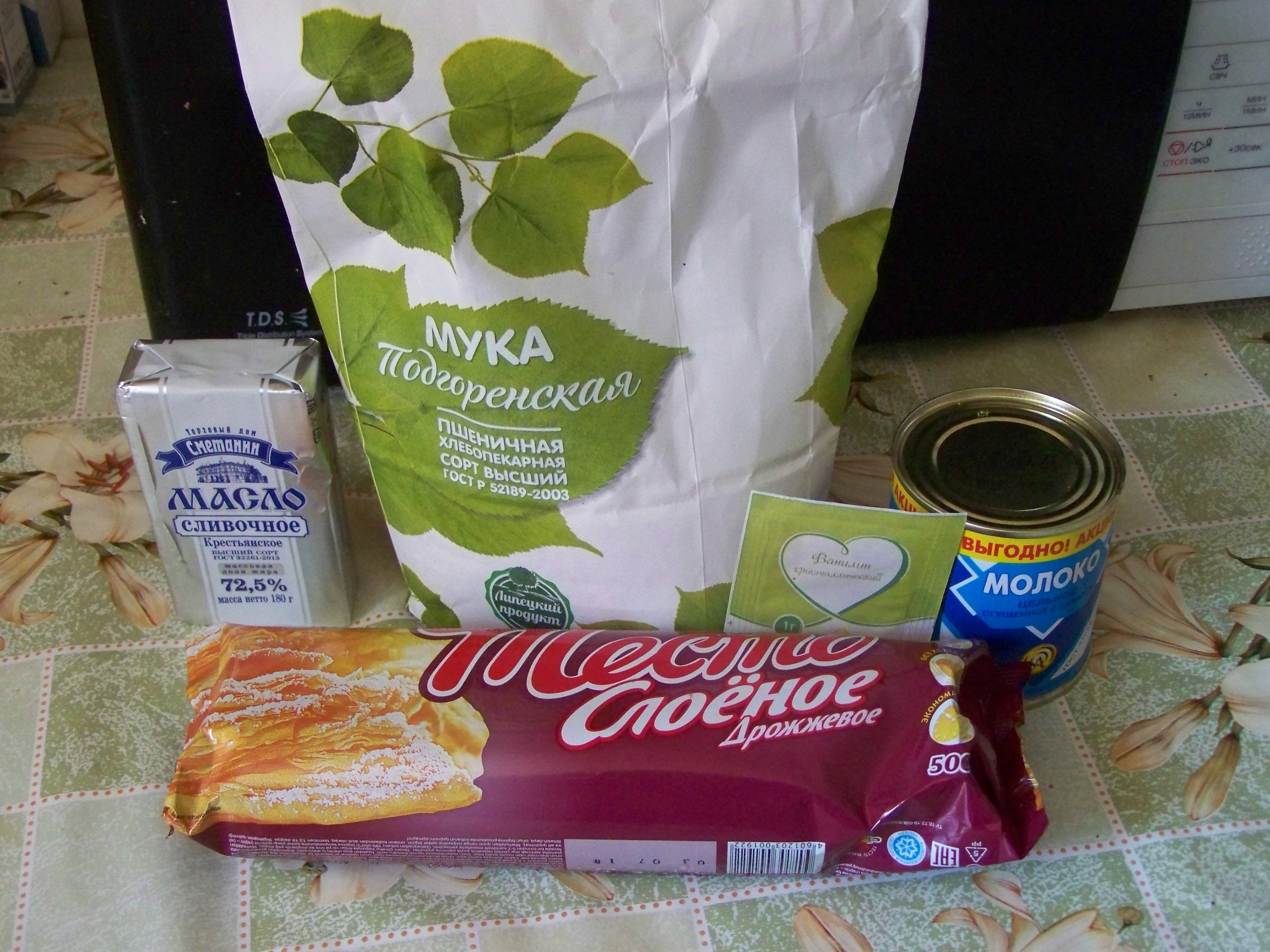 Для его приготовления понадобится: Слоеное тесто 0,5 кг (беру готовое, желательно свернутое в рулет), 1 пачка сливочного масла (180 - 200 г) 72,5% жирности, 1 банка сгущенки из цельного молока (предпочитаю производителя из г. Кореновск, Краснодарского края), 1 пакет ванильного сахара и немного муки высшего сорта. Ниже дано фото всех ингредиентов, которые обычно покупаю в магазине "Магнит".