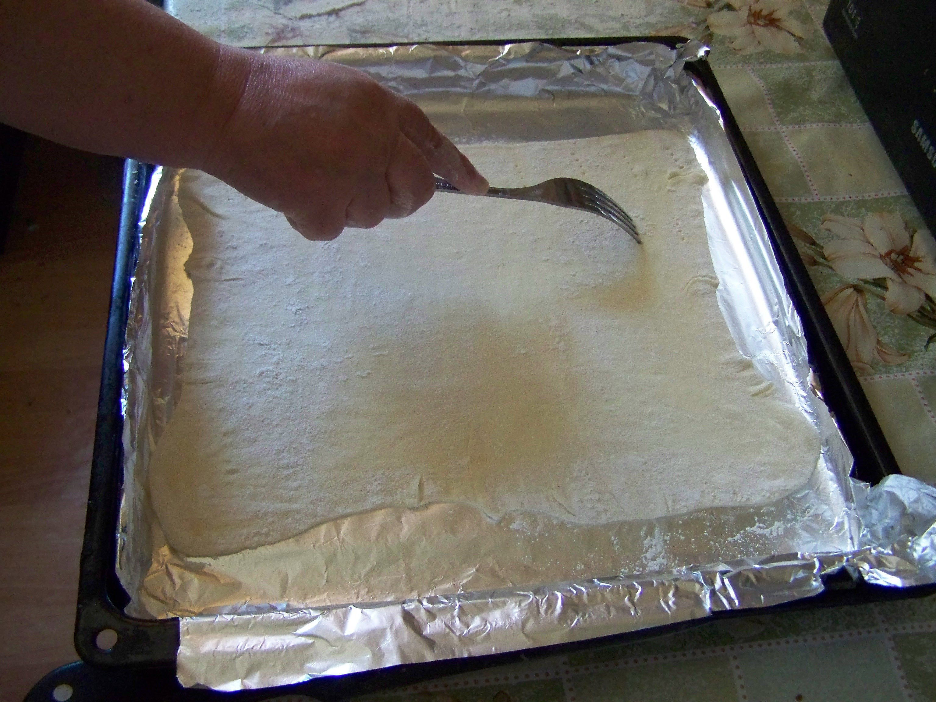 Перед тем как отправить противень в духовку, всю площадь пышки накалываю вилкой, чтобы она при выпечки не вздувалось. Где-то вот так, как показано ниже.