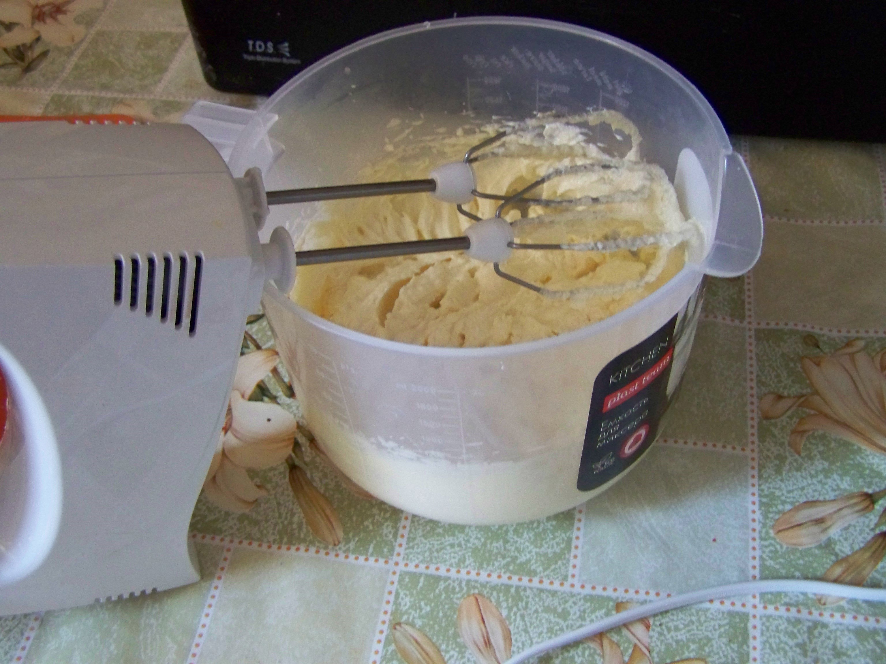 После того как все пышки готовы, начинаю делать крем. Для этого в специальную посуду кладу размягченное масло, порезанное на кусочки, на него выливаю сгущенное молоко, добавляю пакетик ванильного сахара (если добавить просто ваниль, то получается привкус с горчинкой, а это на любителя) и начинаю взбивать миксером до однородной густой белой массы, которая показана ниже.