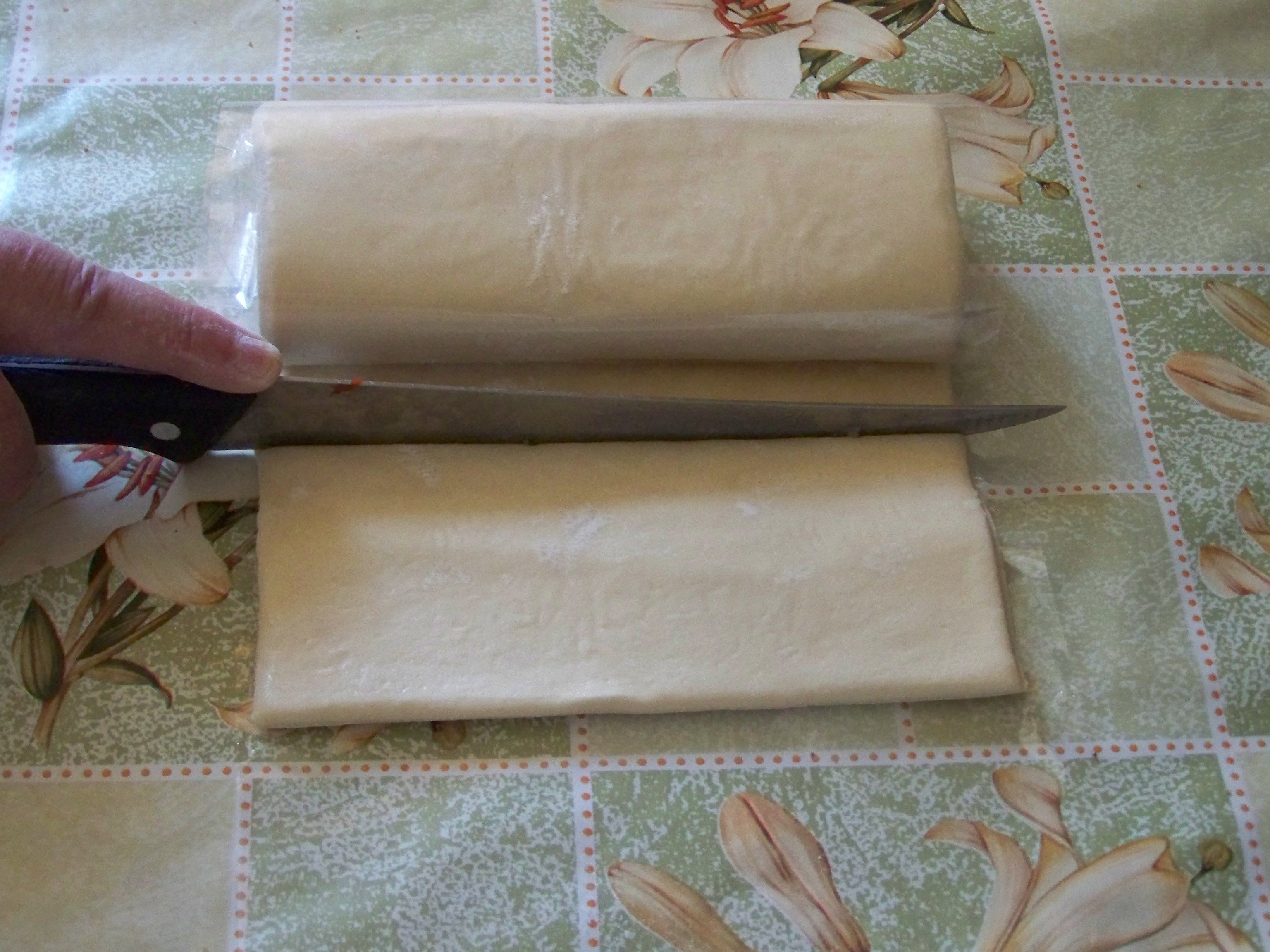 Предварительно достаю из холодильной камеры слоеное тесто и даю ему разморозиться, чтобы оно стало мягким. Тогда оно легко раскатывается. Одновременно с этим также достаю масло, чтобы оно тоже стало мягким. Отмечу, что я использую как дрожжевое, так и бездрожжевое слоеное тесто. Все зависит от того, какое тесто на данный момент находится у меня под рукой.