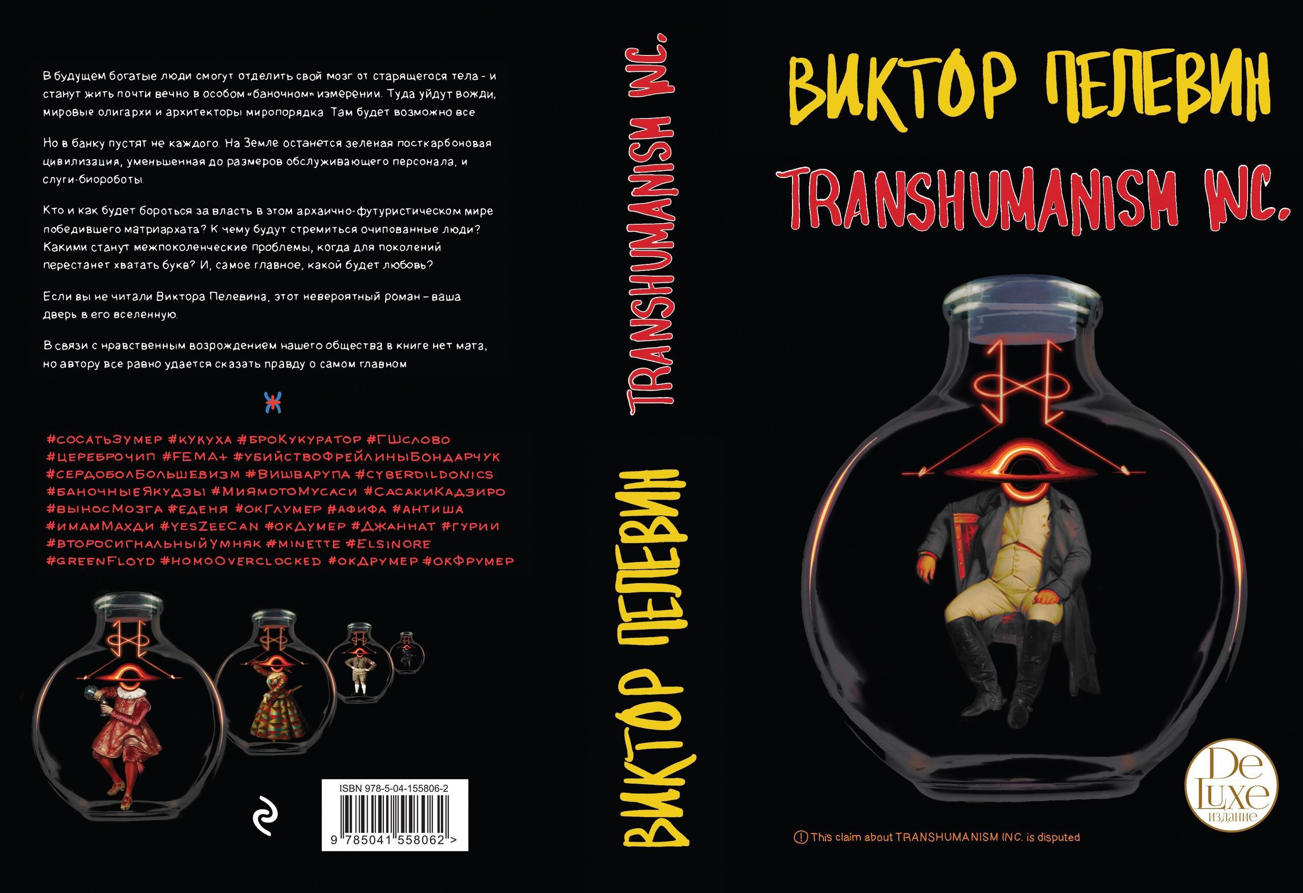 Новая книга Виктора Пелевина будет называться «TRANSHUMANISM INC.», она станет двадцатым романом писателя и выйдет в двух вариантах: основной тираж — в светлых тонах, подарочный вариант c использованием работ автора «Ночь в Фонтенбло» — в темных тонах, в суперобложке, с цветным обрезом и закладкой в виде ленточки ляссе.