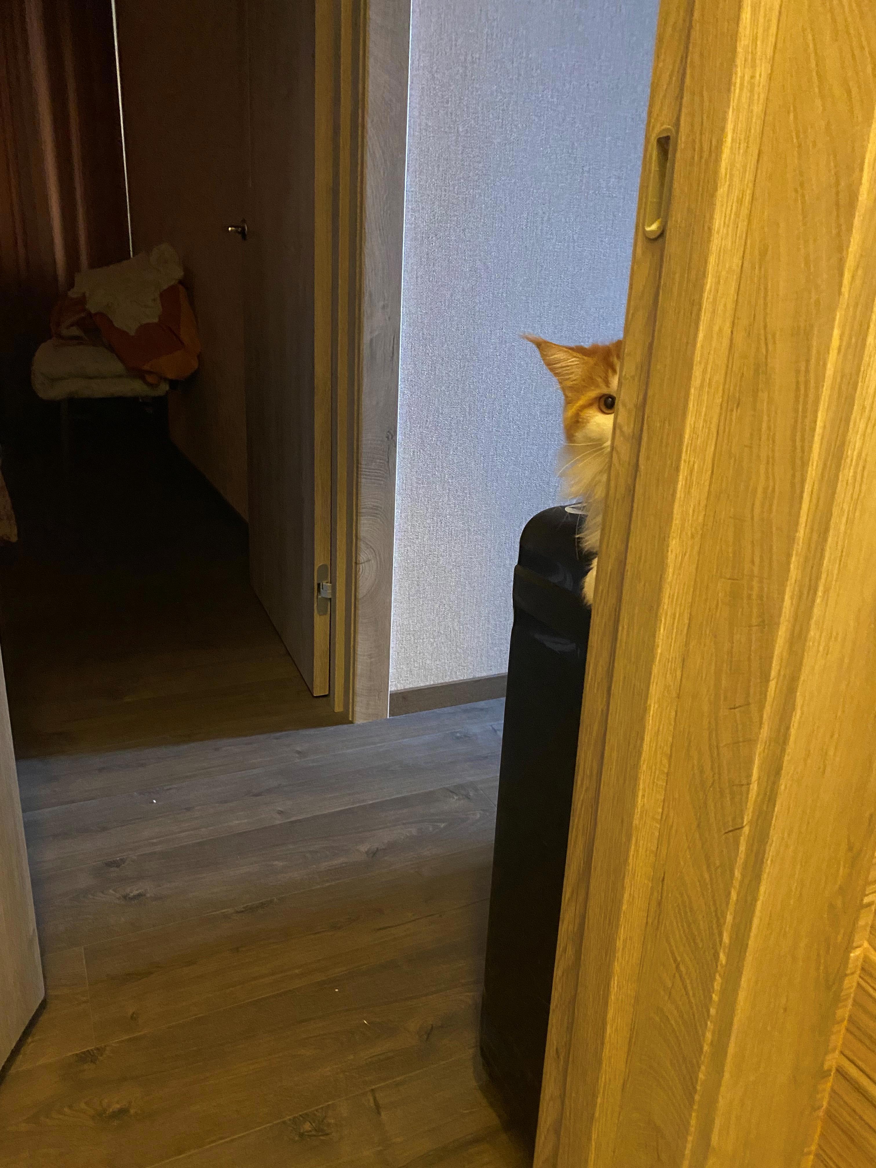 Хитрая морда не терпит закрытых дверей на длительной основе, пять минут может перетерпеть. Потом начинает жалобно мяукать под дверью. А когда открываешь дверь, Кнопа тихонечко выглядывает из-за стены