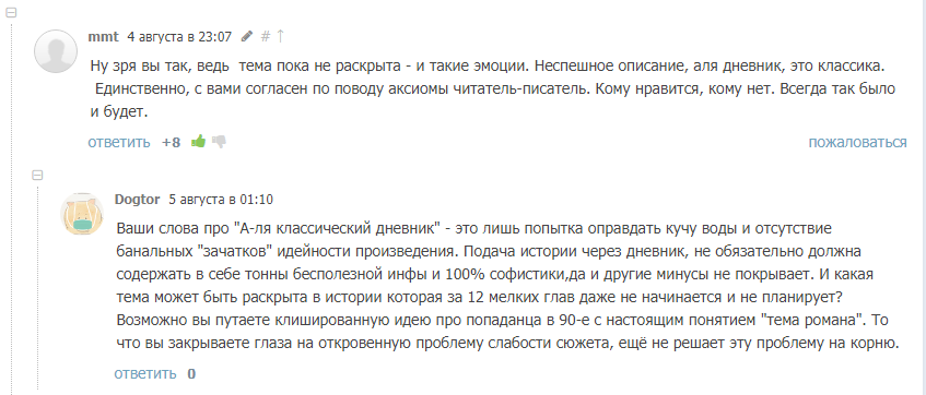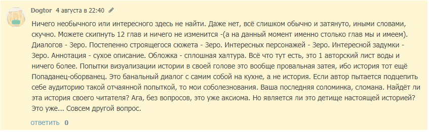 Ведь суть даже не в том что история мне банально не приглянулась. И не в том, что я мудак который ненавидит попаданчество, наперекор всем. Вся суть в ответе, который, я получил на, как мне кажется, обоснованную критику.