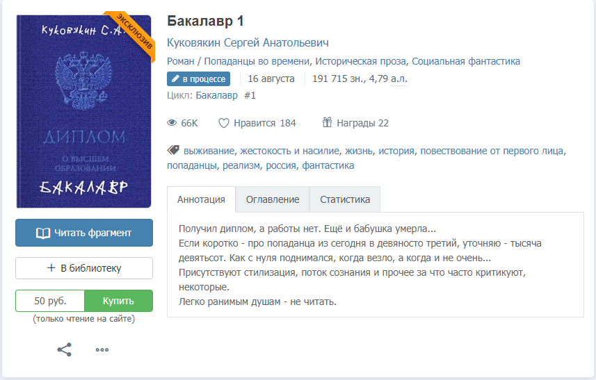 Наверно и так понятно, что мне люто не зашла эта водичка в оболочке книги. На момент моего прочтения, "книга" только начиналась и я имел лишь 12 глав на ознакомление. Таких больших цифр, которые мы можем наблюдать сейчас не существовало, а выделяющийся из общего синего тлена зелёный ценник в 50 рубликов, был лишь в зародыше. Но, даже этих 12, настолько мелких глав, что любой коротышка зальётся краской, мне хватило, что бы понять, что это просто не стоит запланированного на трату, времени.