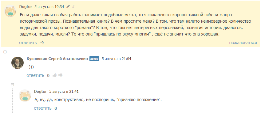 А я, не испытываю ненависти ни к человеку, ни к его книгам, он у меня вообще в друзьях вроде висит (если это слово вообще что-то значит). Мне не понравилась его крайне слабая работа и я её раскритиковал, на этом всё. Я не проявляю агрессии и стараюсь отвечать грамотно, основываясь не на личности автора, а на том, что он выдал мне на критику. Также, я не считаю своё мнение единственно правильным. Даже больше скажу, если бы автор как-то попытался мне что-то объяснить или доказать, то я, может быть, даже согласился бы с некоторыми его пунктами. Но это должно было произойти в том случае, если бы автор мне ответил нормально. И тут начинается самое интересное, на мой вкус.