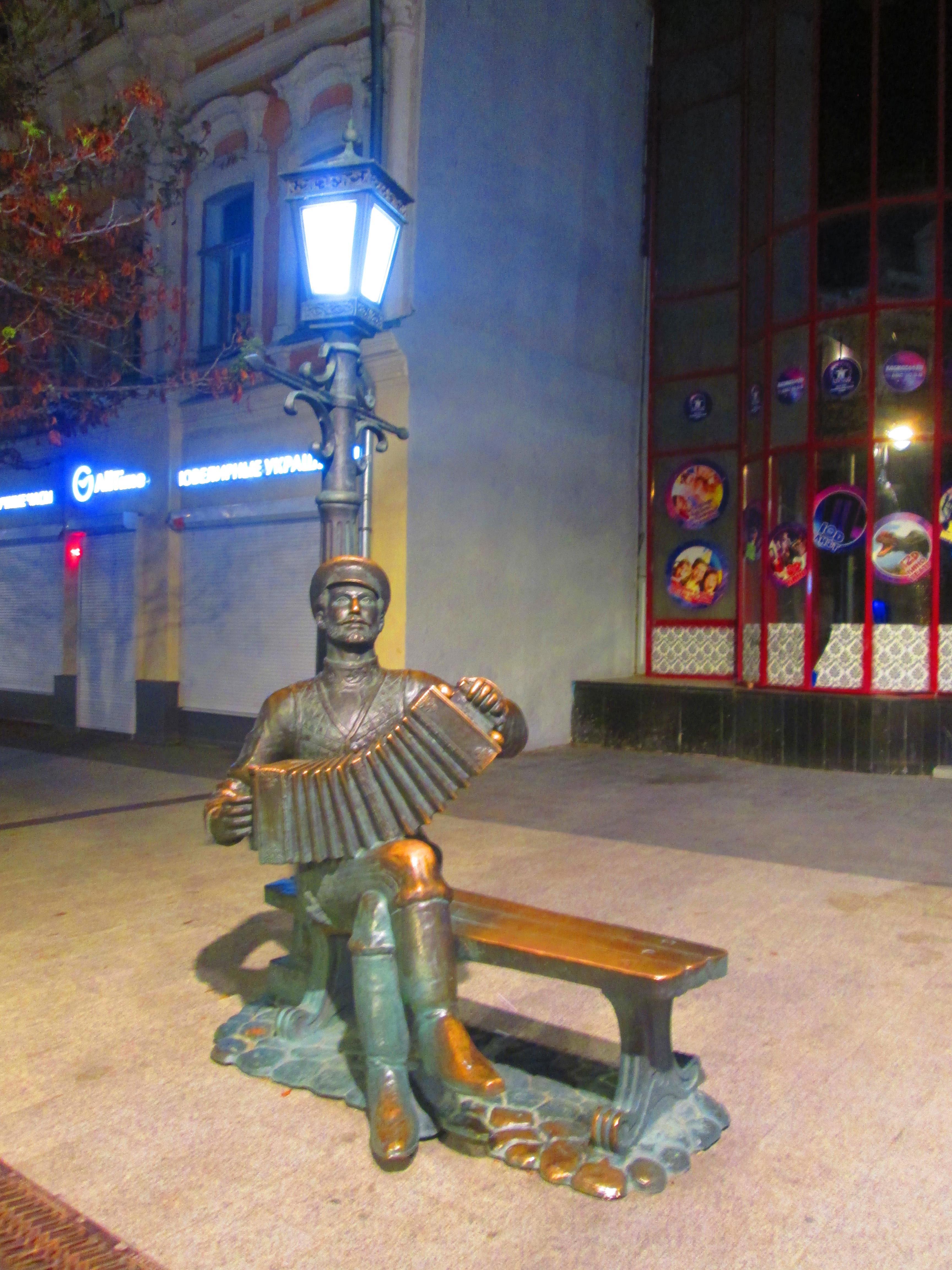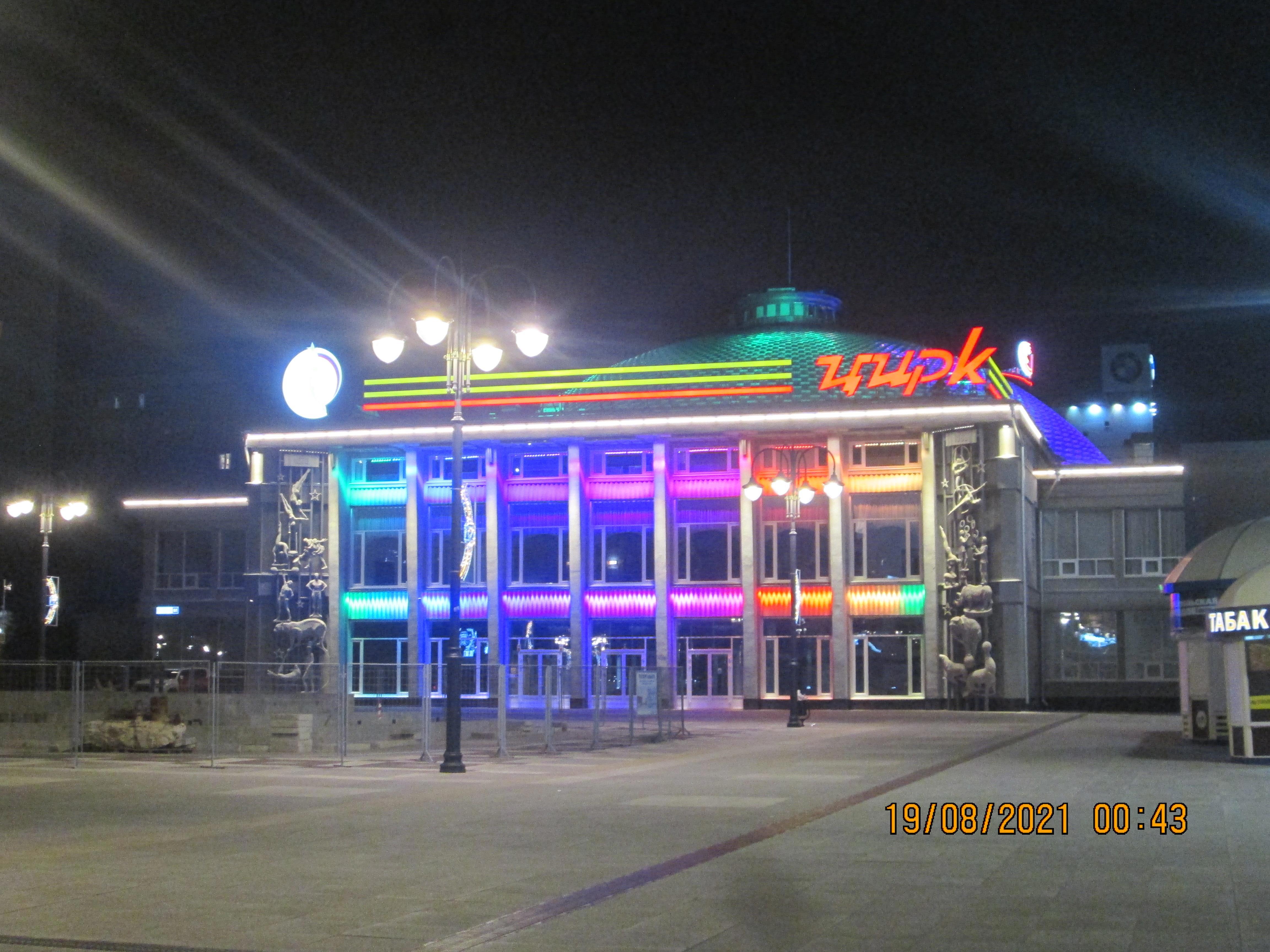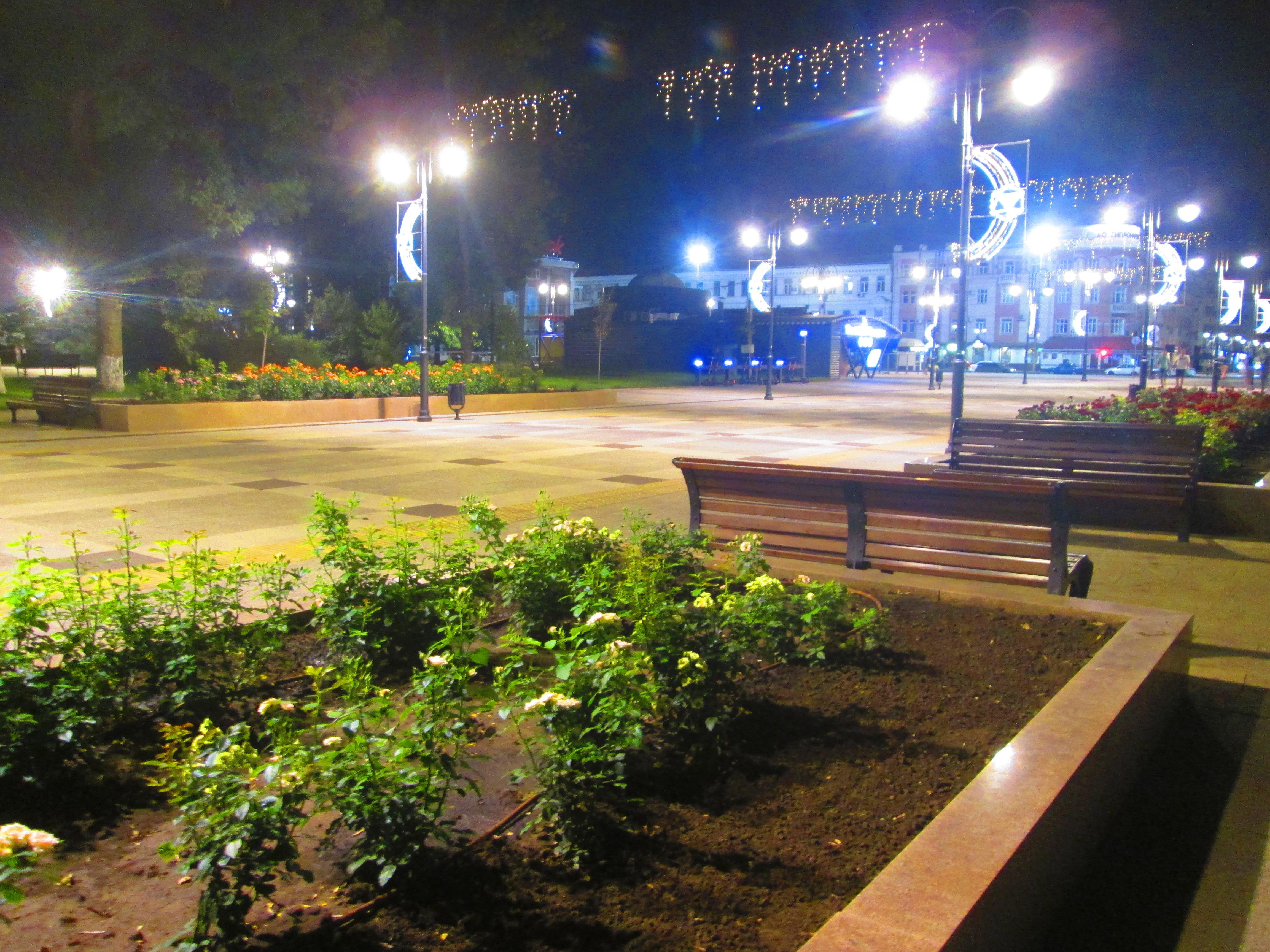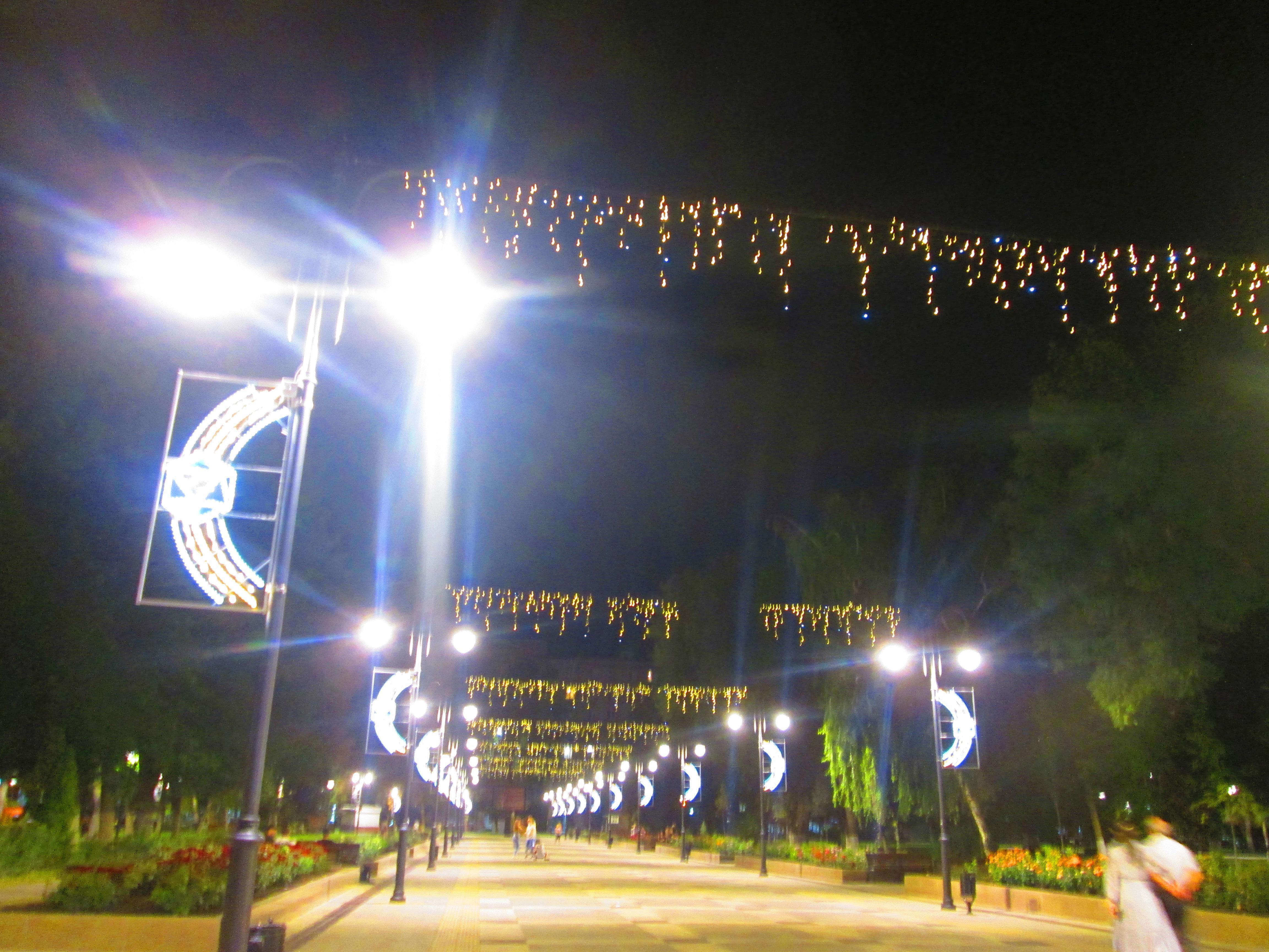 Потом мы прошлись к фонтанам у готического здания филармонии и обратно. И направились по Кирова в сторону вокзала, дошли до Рахова. Полюбовались светящимся зданием цирка, аллейкой в огоньках. Жара по прежнему была неимоверной, и нам хотелось влезть на какой-нибудь из поливающихся газонов.