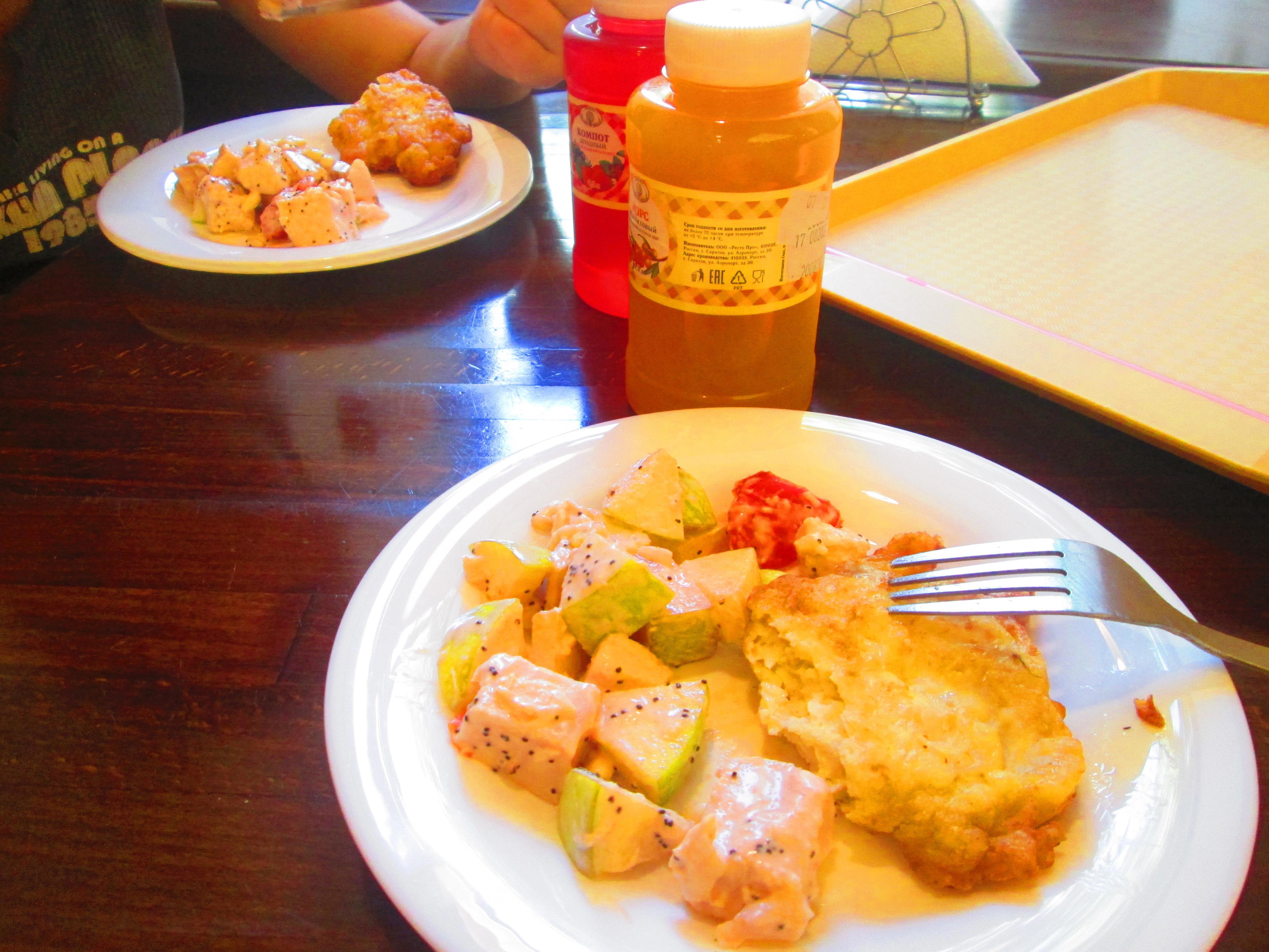 Заказали салат «Дамский каприз» (с куриной филешкой в придачу), который порадовал нас пикантностью, ягодный компот и облепиховый морс, и пироженки.
