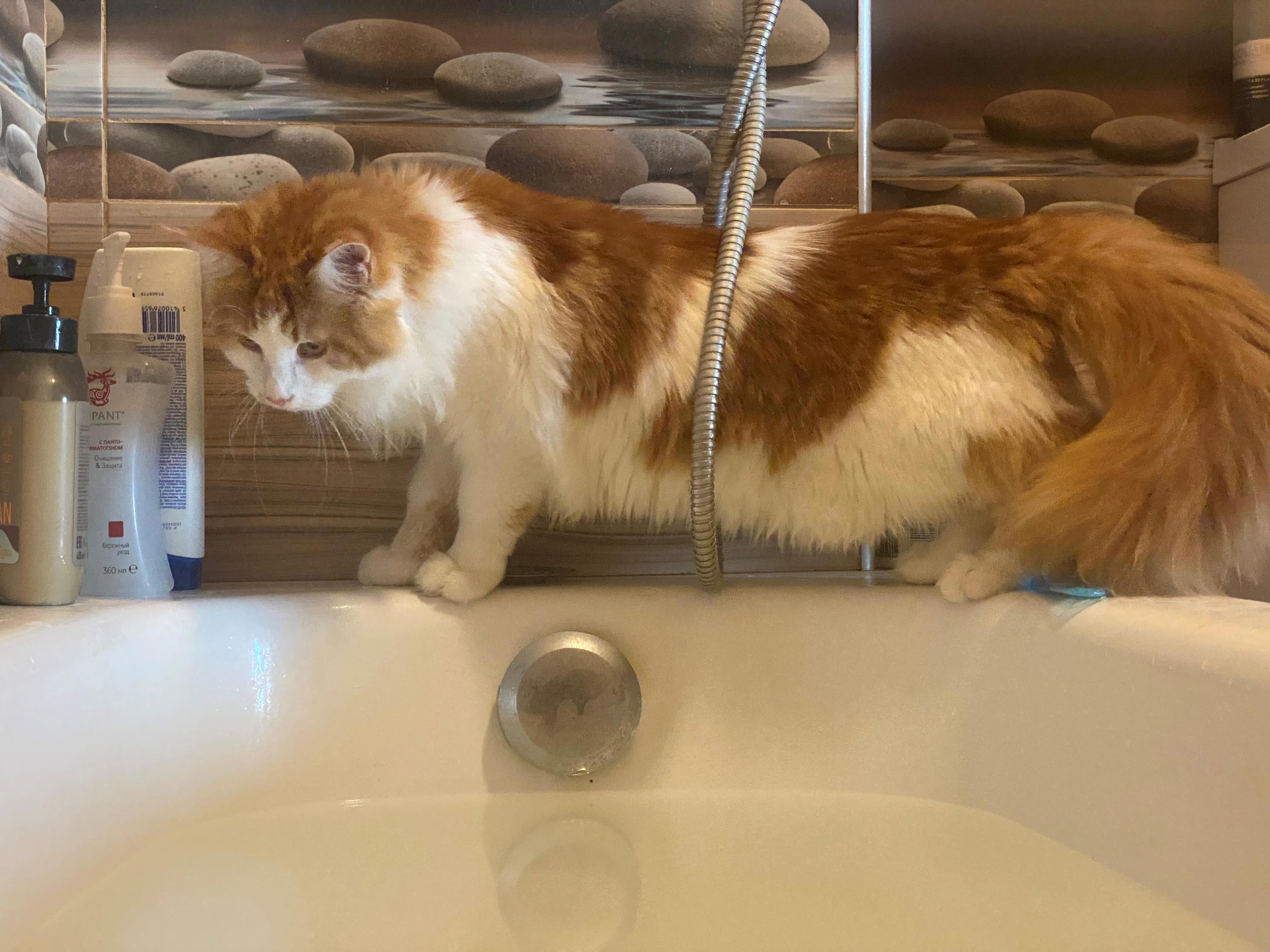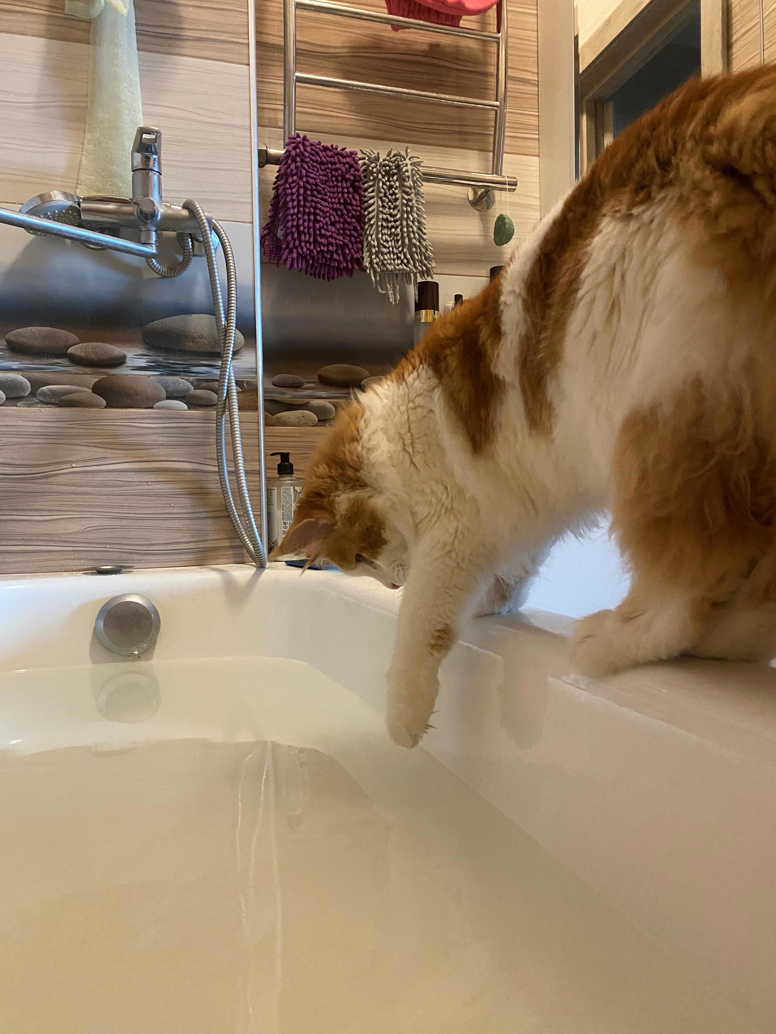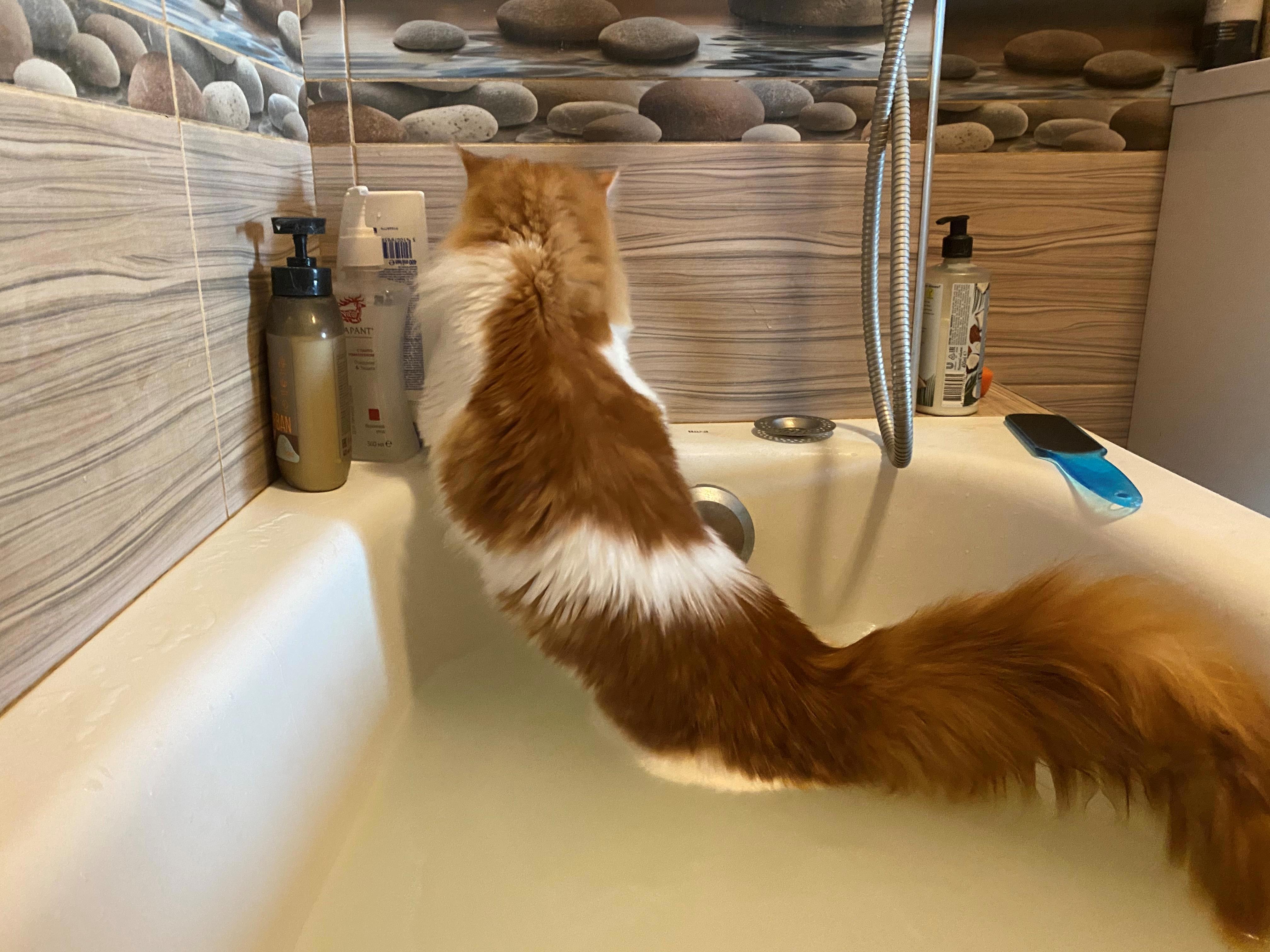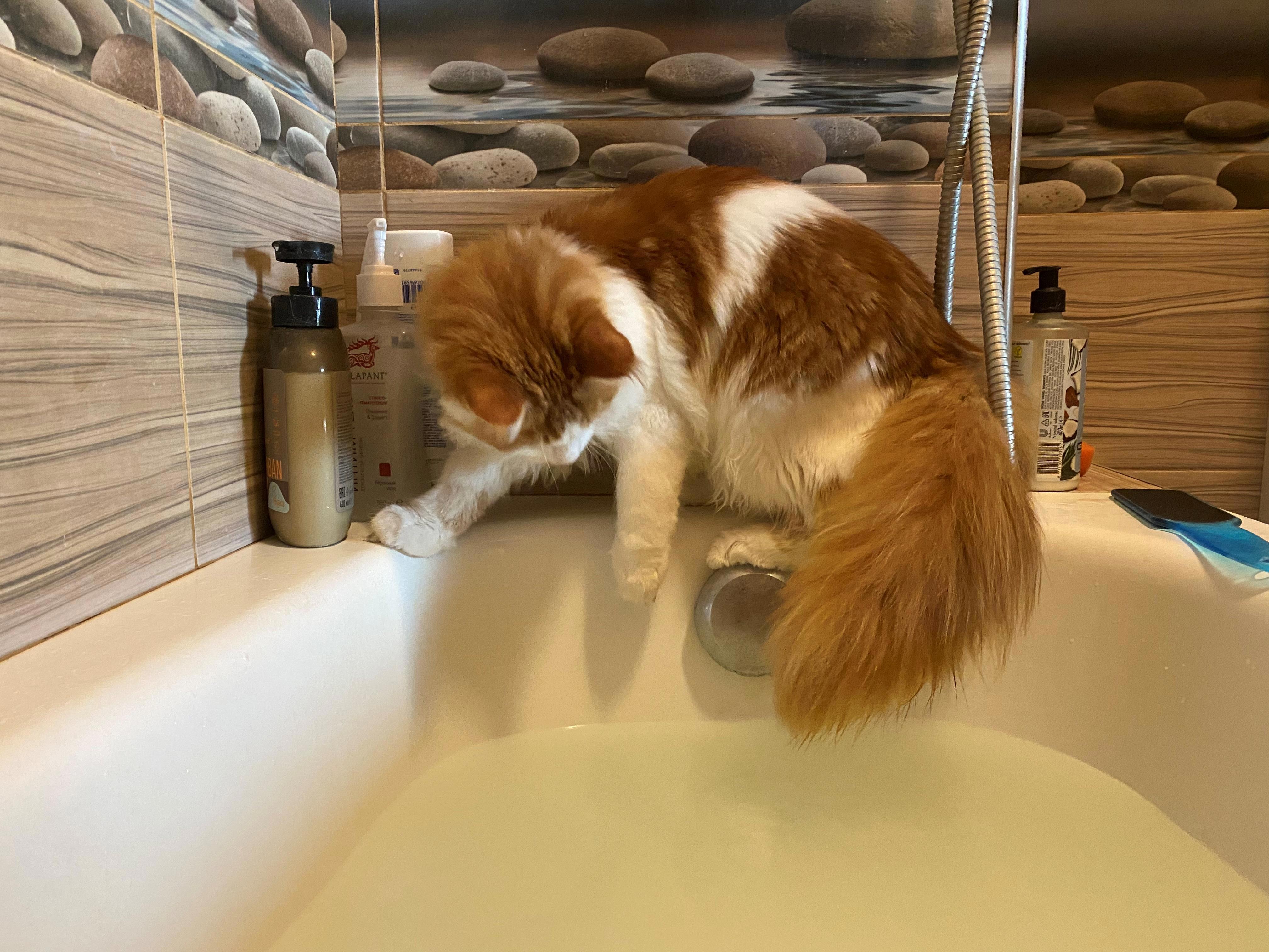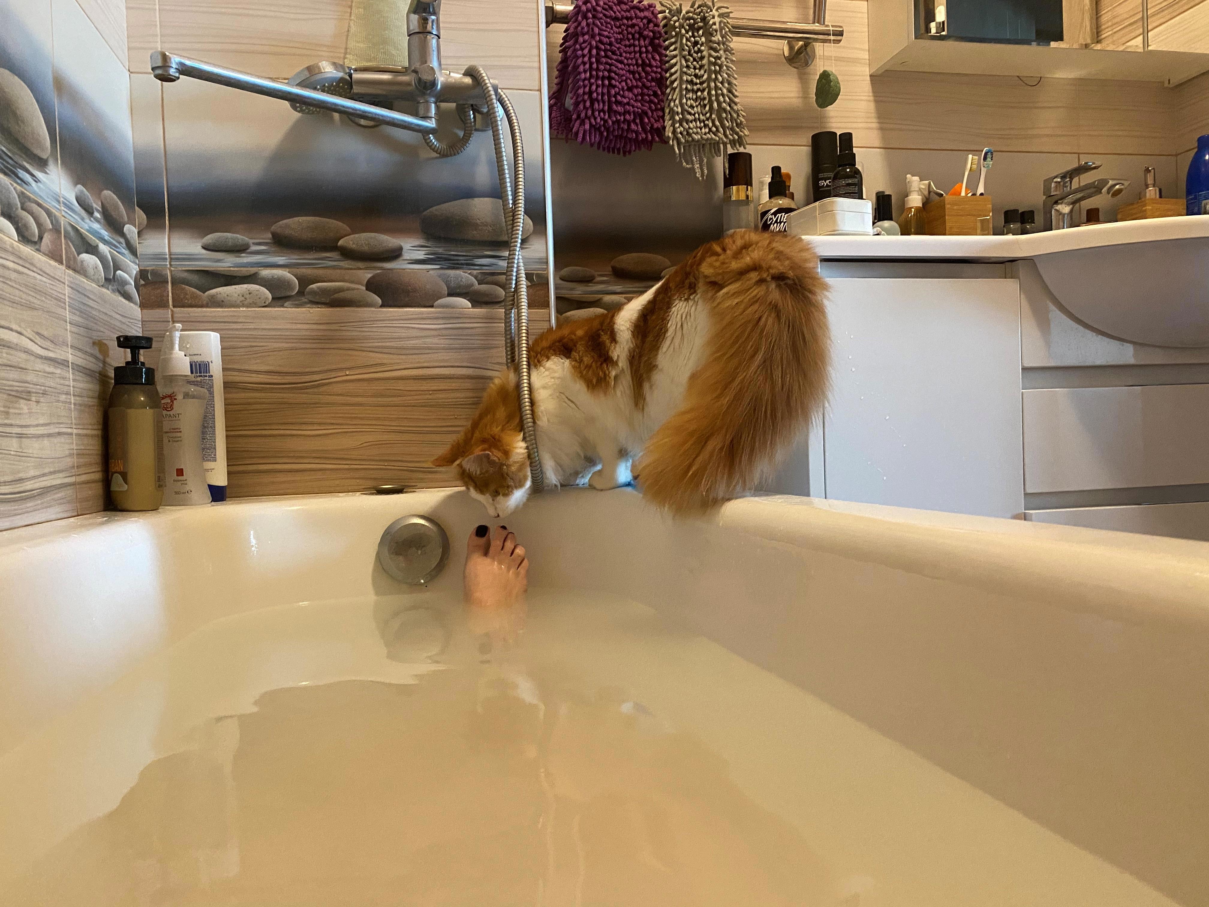 И напоследок - маленькая Кнопка отказывается выходить из ванны, которую я собираюсь принять. Здесь мы ещё в Петербурге.