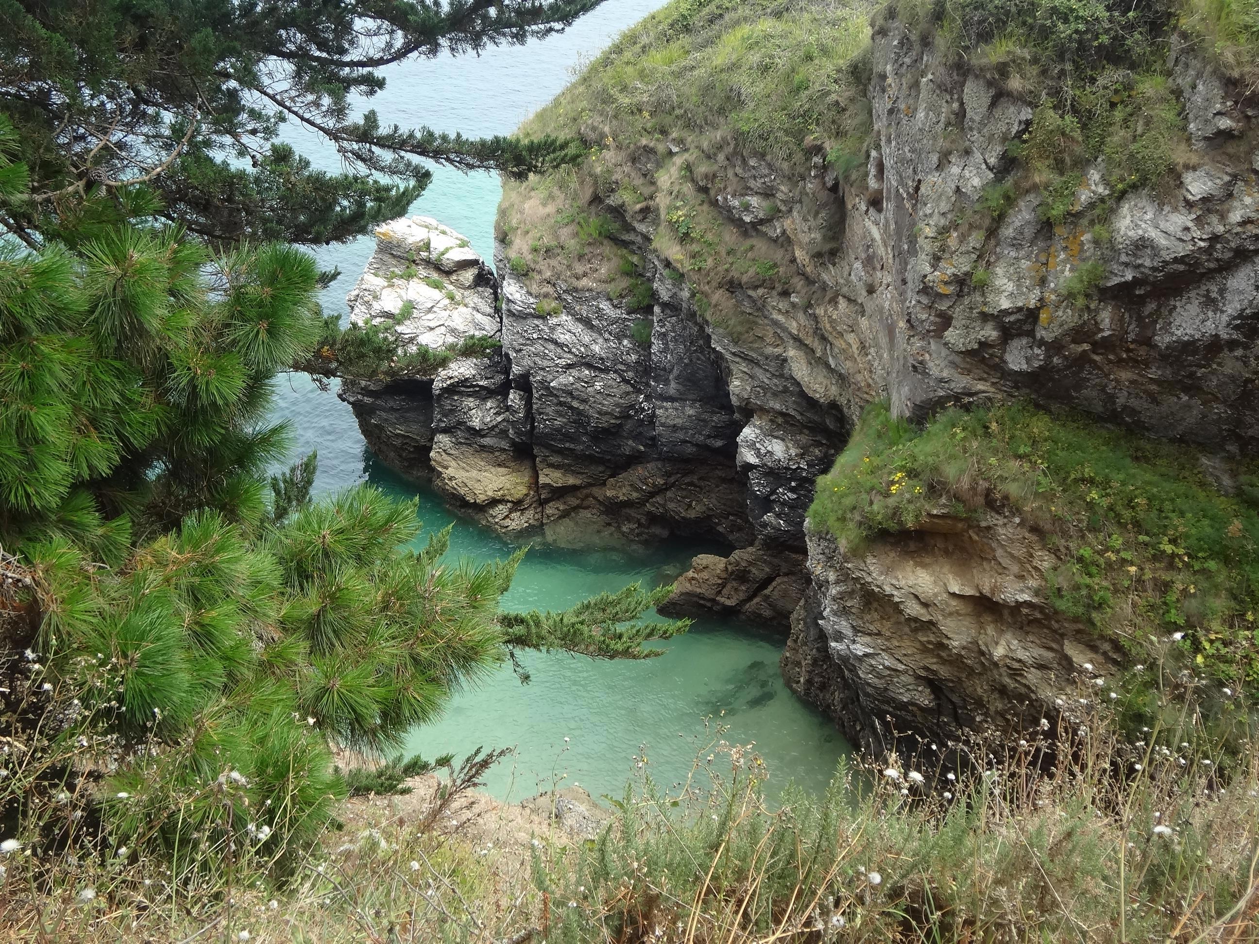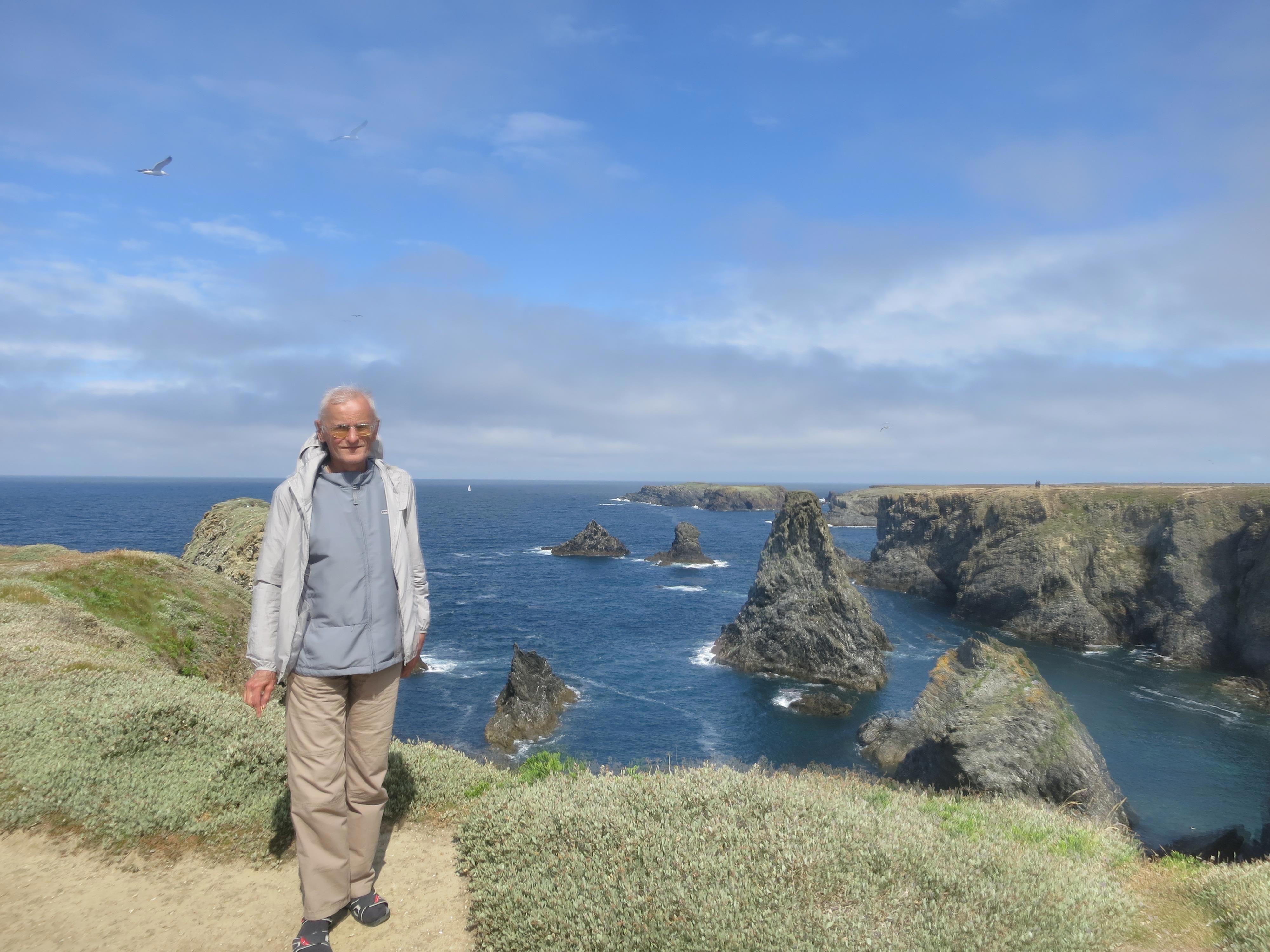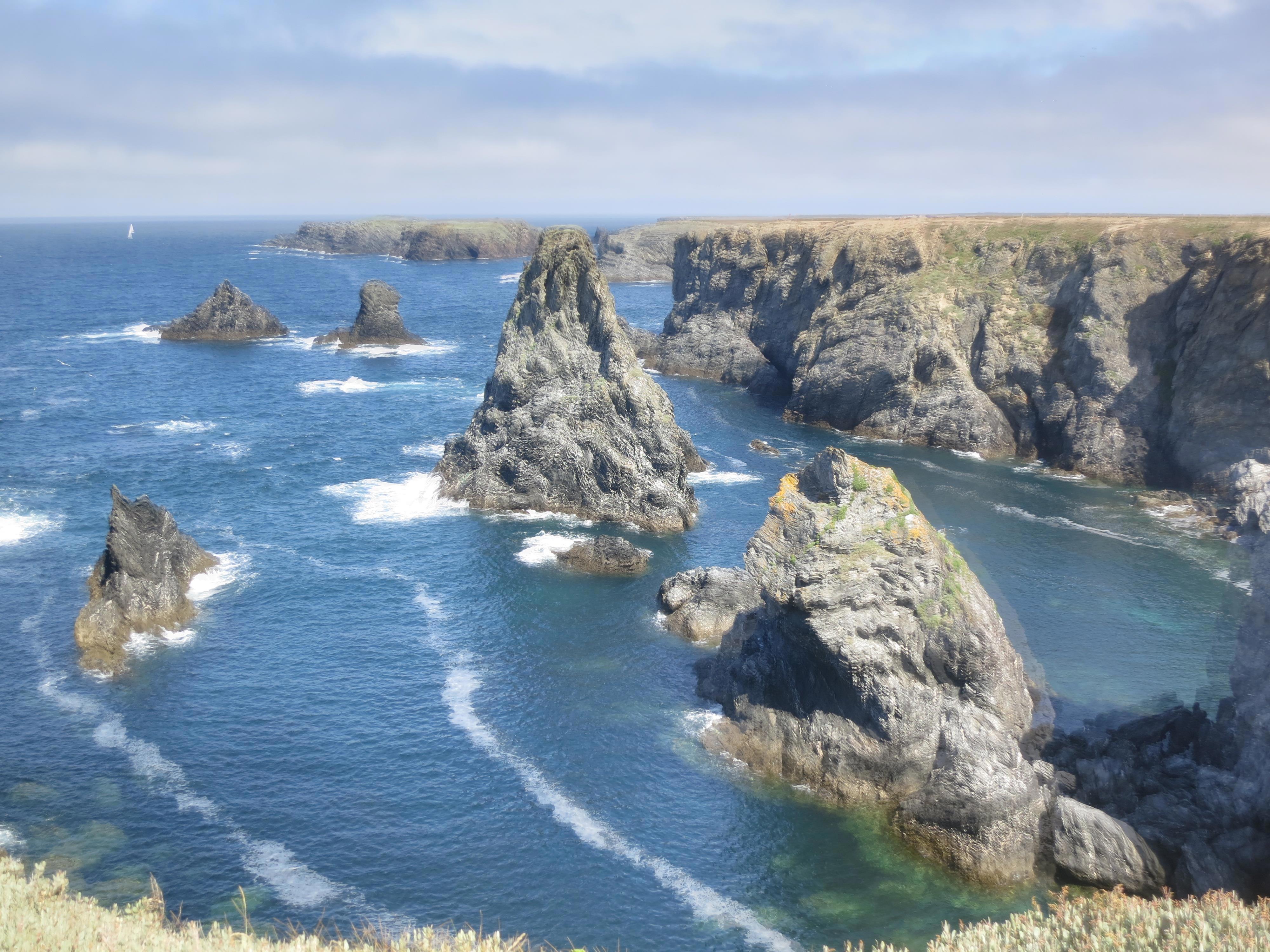 Бель-Иль в переводе – Прекрасный остров. Находится у берегов Бретани (Франция) в Бискайском заливе. Впервые я узнал о нем из романа А.Дюма «Виконт де Бражелон».Тогда мое литературное знакомство с островом было омрачено описанной в романе гибелью Портоса ( одного из любимых героев еще «Трех мушкетеров») в одной из его пещер. Подробностей уже не помню, поскольку прочитанные в детстве залпом три тома «Виконта» позднее не перечитывал, а теперь вряд ли смогу их одолеть. Та пещера в реальности наверняка не существует, да и не искал я ее. Остров прекрасен другим – своими пейзажами. И не зря он привлек внимание известного французского художника Клода Моне. Осенью 1886 года он написал здесь 39 работ, в том числе – «Пирамиды в Порт Котон, бурное море», известную и под названием «Скалы в Бель-Иль» (находится в ГМИИ им. Пушкина). Это место у меня на первых фото.