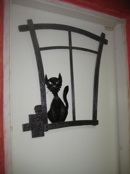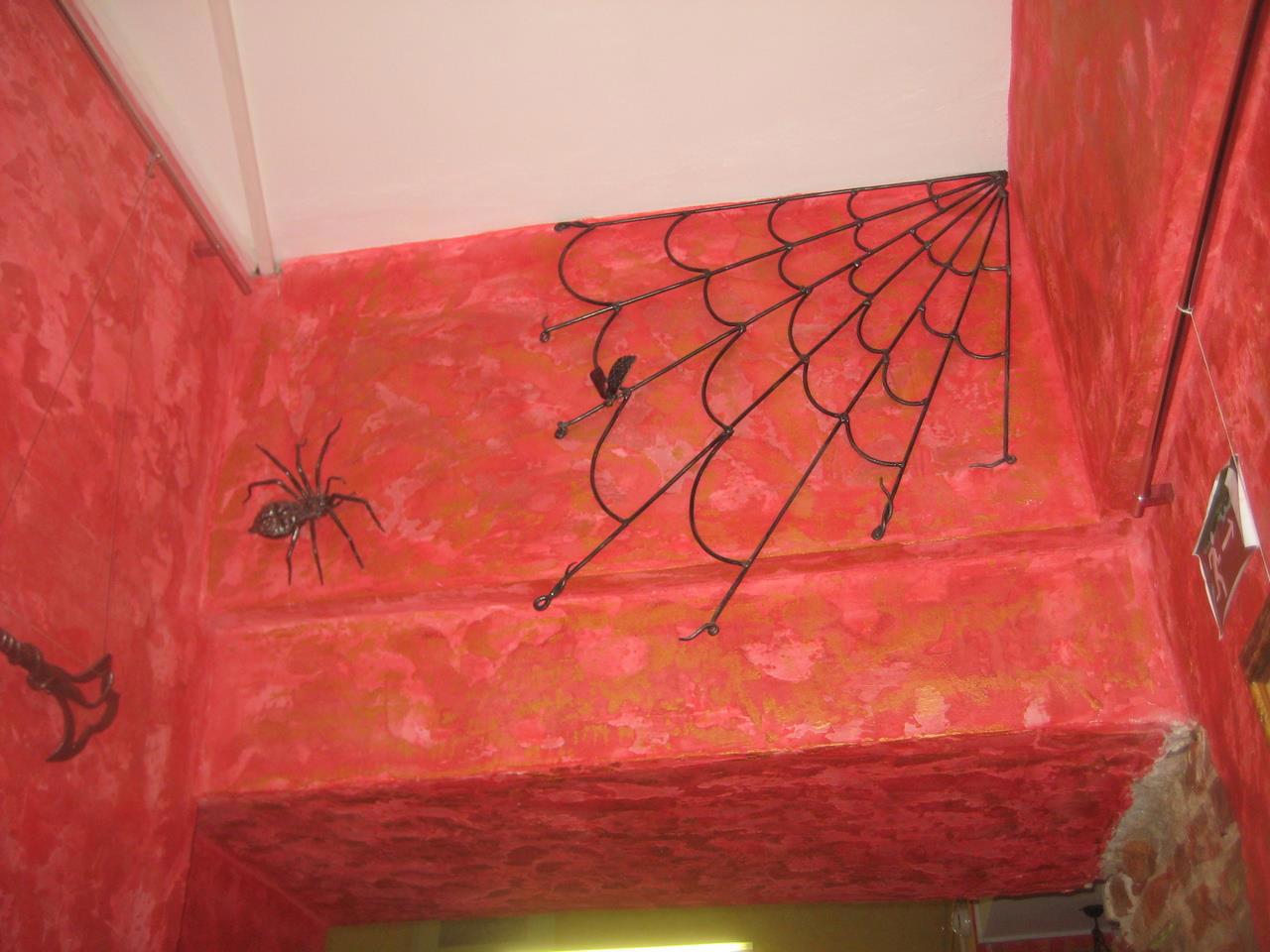 Паучиная инсталляция на притолоке над дверью, у кого арахнофобия, как у моего сына, стараются побыстрее проскочить мимо:
