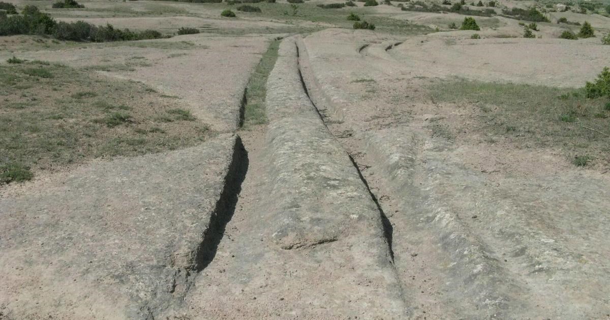 А ещё есть такие следы в Казахстане, например... И что же получается? А получается, что это достаточно распространённое явление в мире. И материал, в котором пробиты эти колеи, везде разный - кроме туфа, есть ещё известняк, песчаник и другие. Датировки геологов в максимальных значениях достигают десятков миллионов лет, а датировки историков доходят до 5 тысяч лет до н.э.