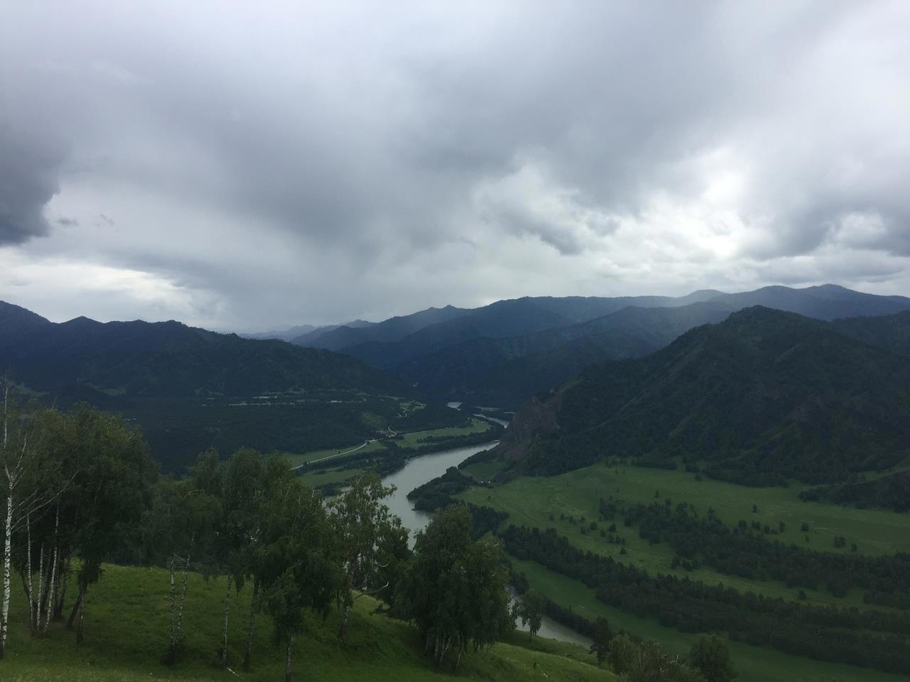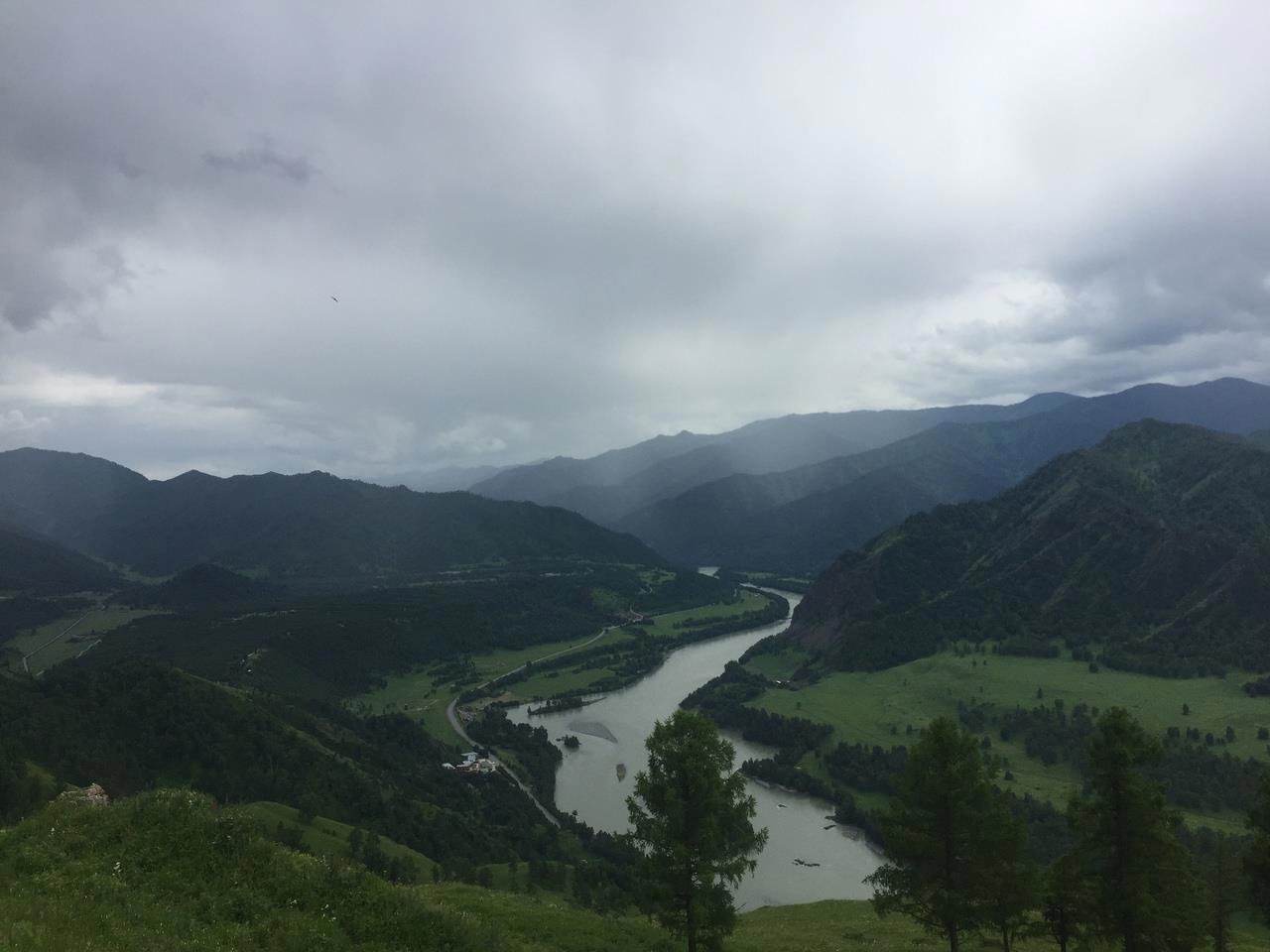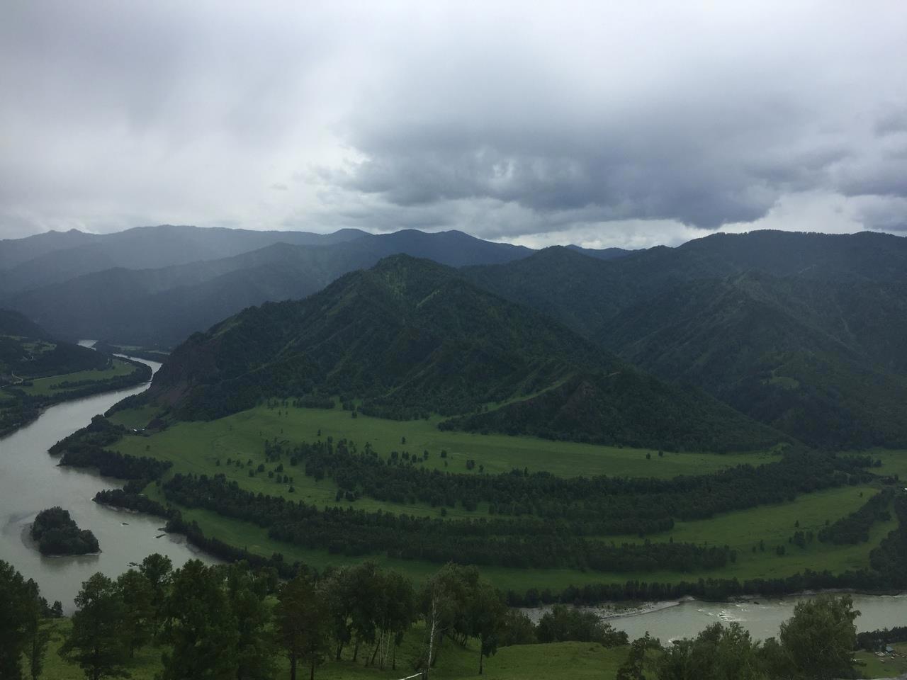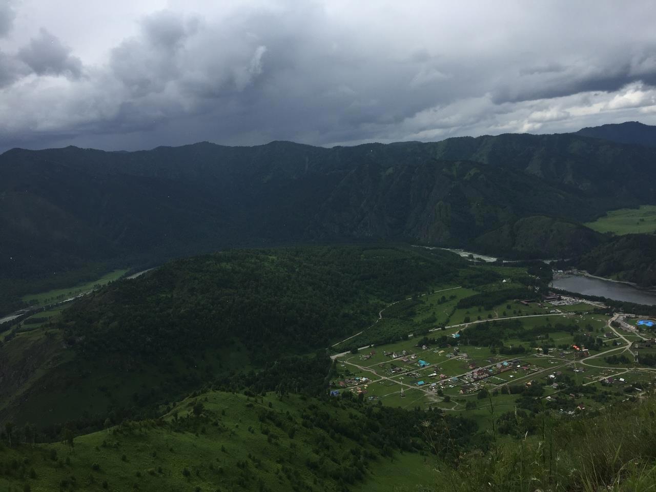 Со второй вершины, где нас хоть не на долго, но всё же застал дождь, село Чемал напоминает больше карту, чем реальный вид.