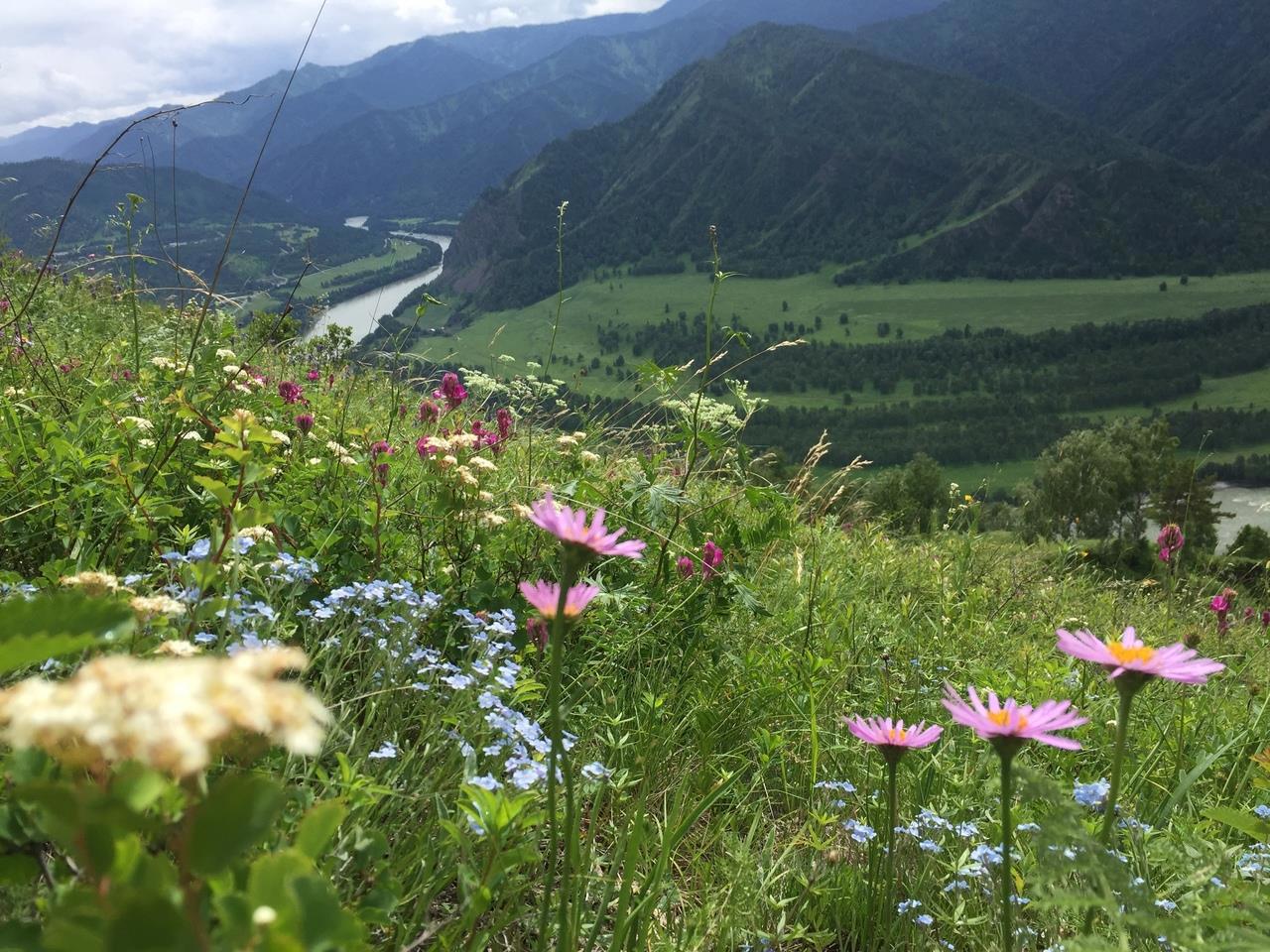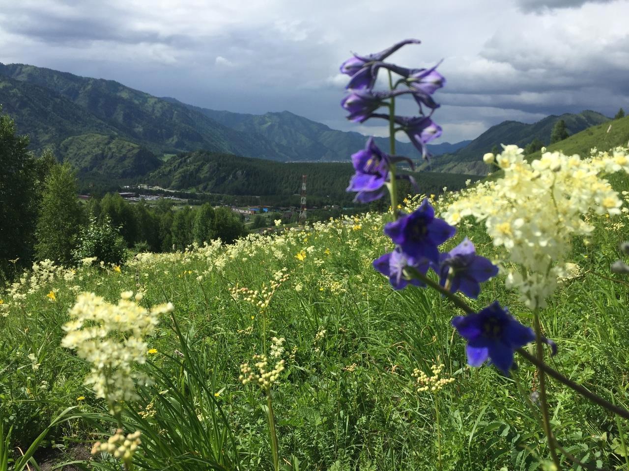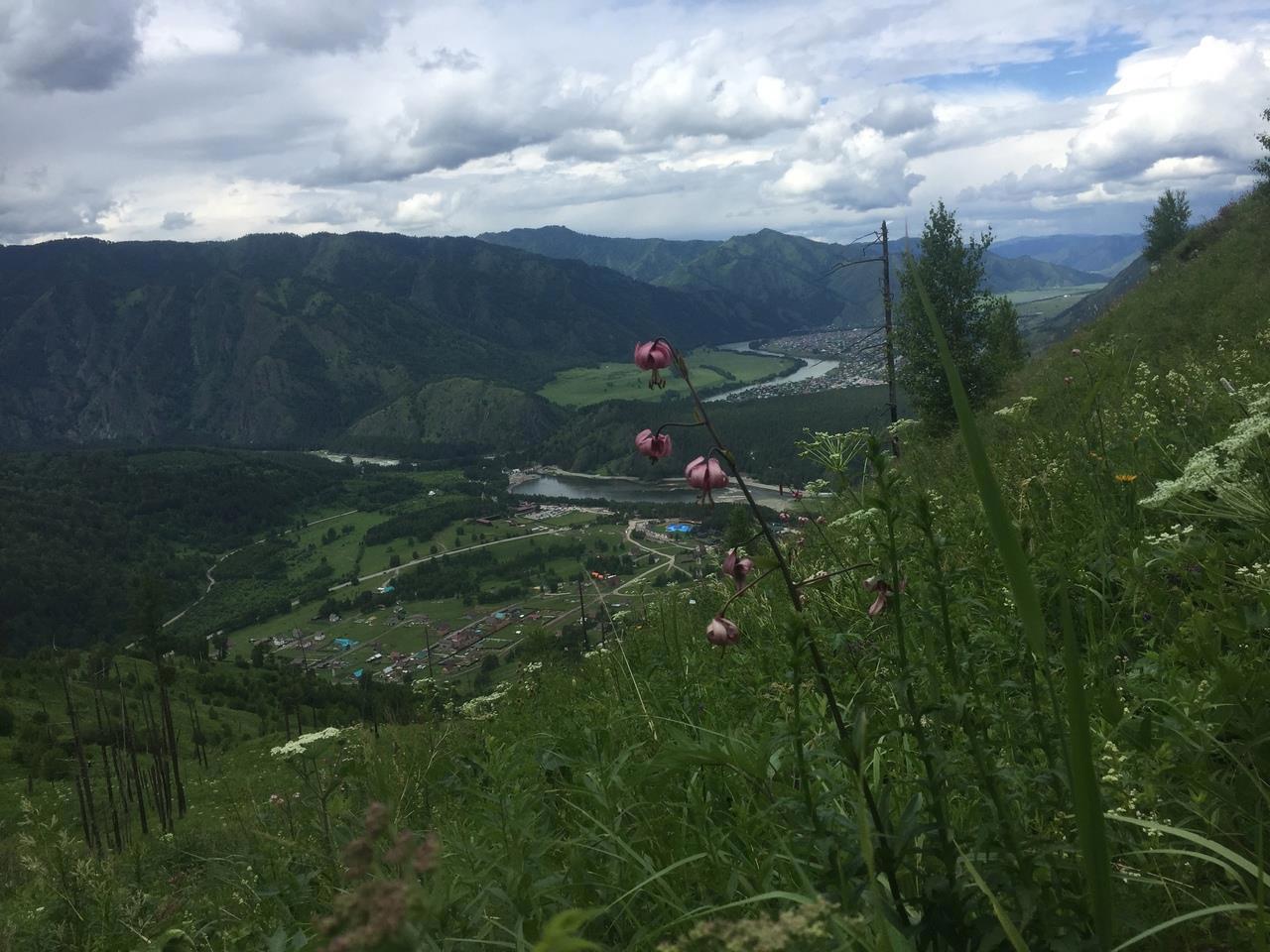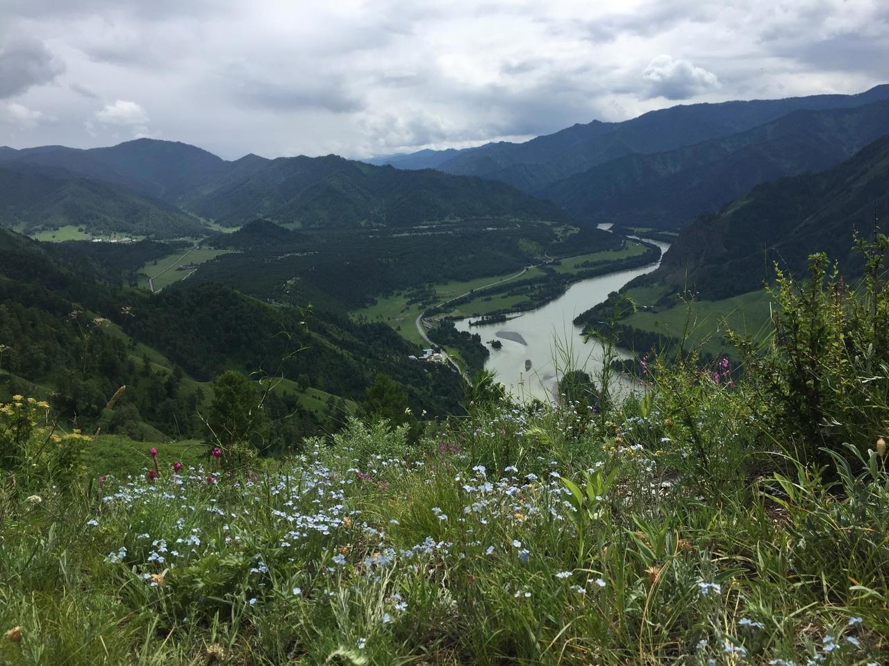 Со второй вершины, где нас хоть не на долго, но всё же застал дождь, село Чемал напоминает больше карту, чем реальный вид.