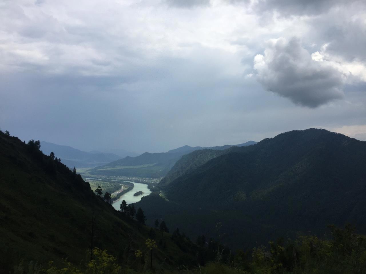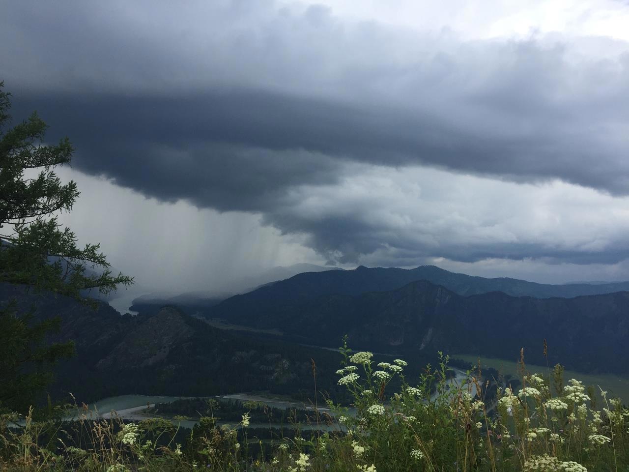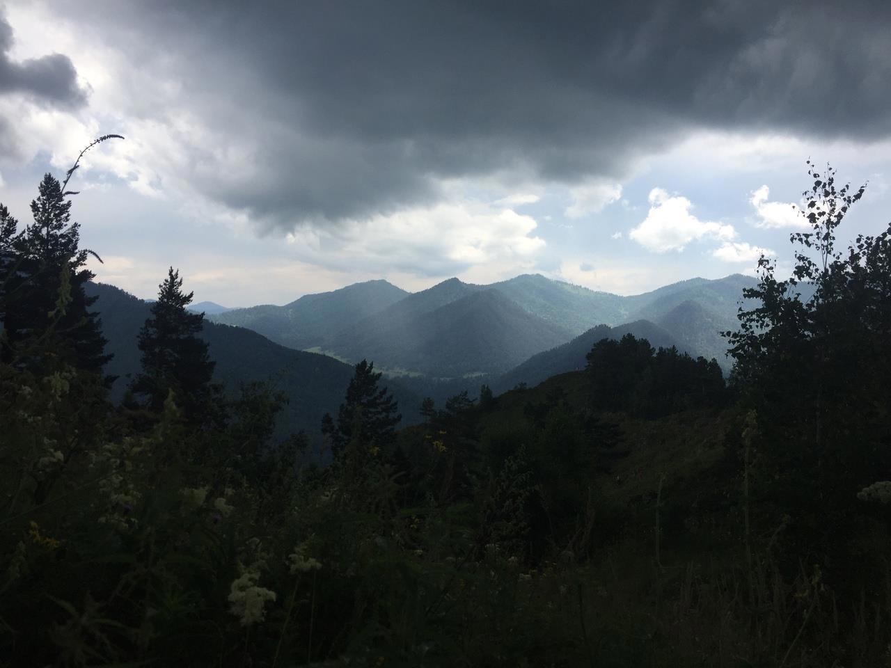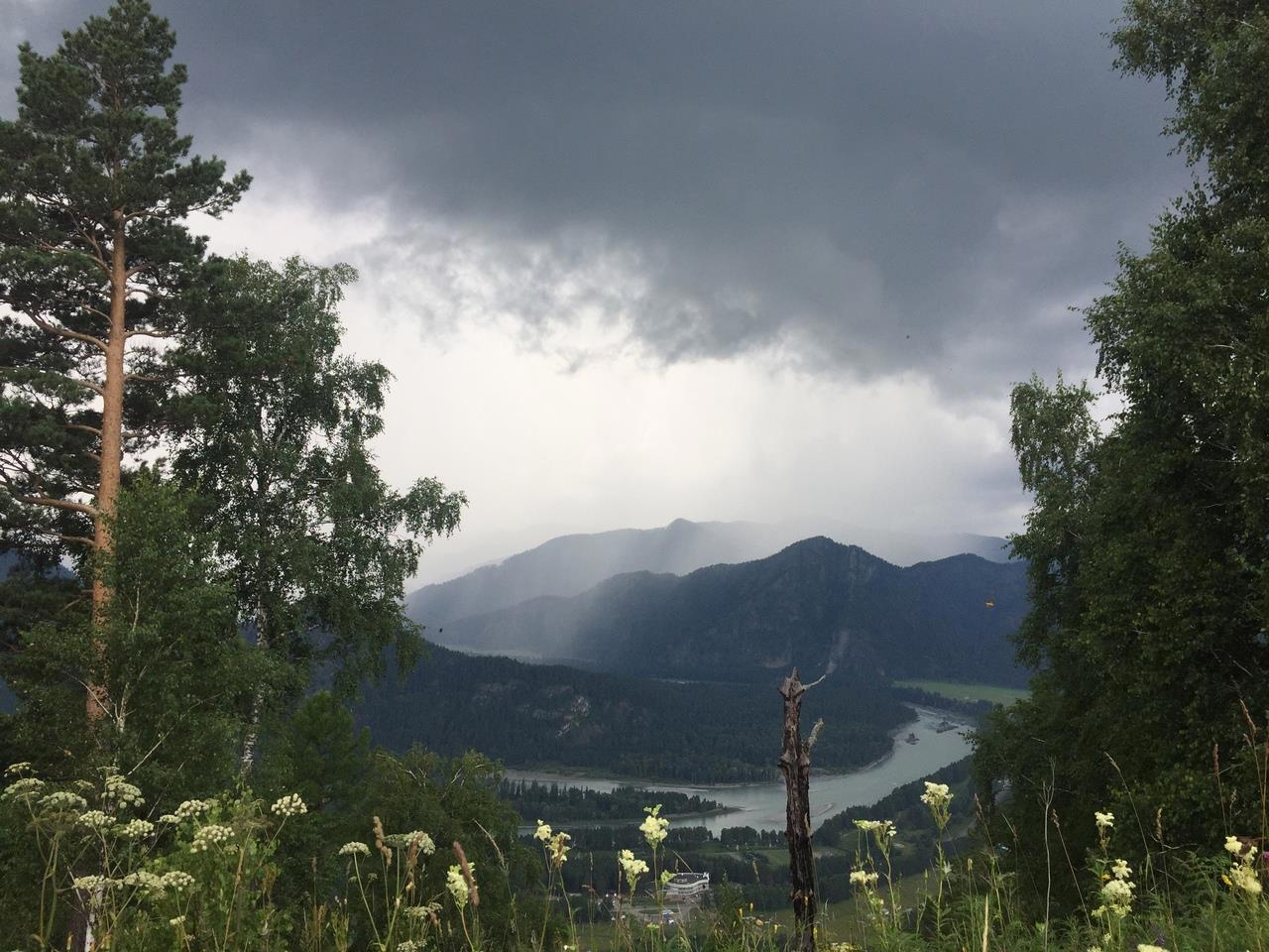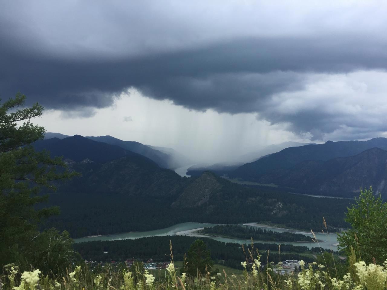 На обратном пути хан Алтай решил нас хорошенько умыть. Проливной дождь мгновенно скрыл все горы вокруг и залил тропинки.
