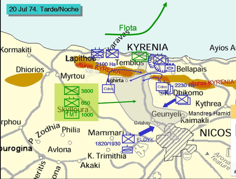 В районе 18.00 к плацдарму подошли силы 306-го и 326-го батальона гвардии (последний был спешно собран через мобилизацию в самой Кирении), а после только в районе 19.00 – 286-ой батальон, поддержанный тремя танками Т-34-85 и артиллерией, уже со стороны Никосии.