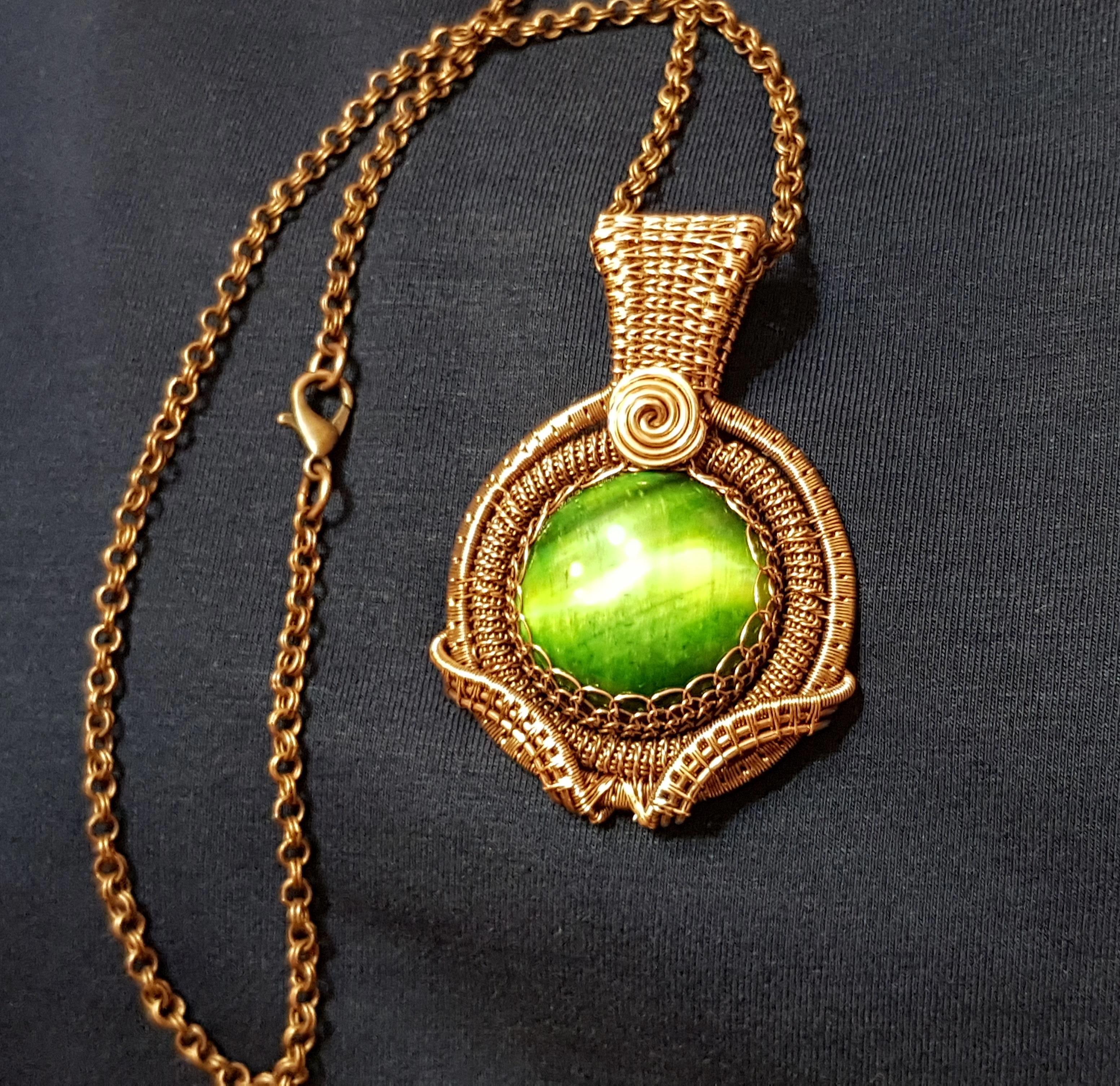 Подвеска "Даллан". Камень - кошачий глаз. Глаза сержанта изумрудно-зелёные, что стало неожиданной проблемой - мы чуть было не спутали камни, ведь зелёный цвет ассоциировался с эльфами больше фиолетового. Даллан обычно сохраняет каменное лицо в любой ситуации и никогда не теряет самообладания, так что прохладные оттенки в цветах камня не случайны. Её взгляд чаще всего безмятежно-спокоен. В отличие от подруги-эльфийки, сержант - в первую очередь воительница, не расстающаяся с лёгкой кирасой и облегченным полуторным мечом. Чтобы отразить воинскую суть девушки, Артём использовал в подвеске кольчужное плетение, а сама она имеет форму щита - круглого, в скандинавском стиле. Благо Даллан из герцогства Эльварт, где живут близкие (и более цивилизованные) родичи воинственных налётчиков с северных островов. Ну и стоит помнить, что сержант в первую очередь защитница - и в прошлом, когда служила телохранителем августейшей особы, и сейчас, когда стала наёмницей.