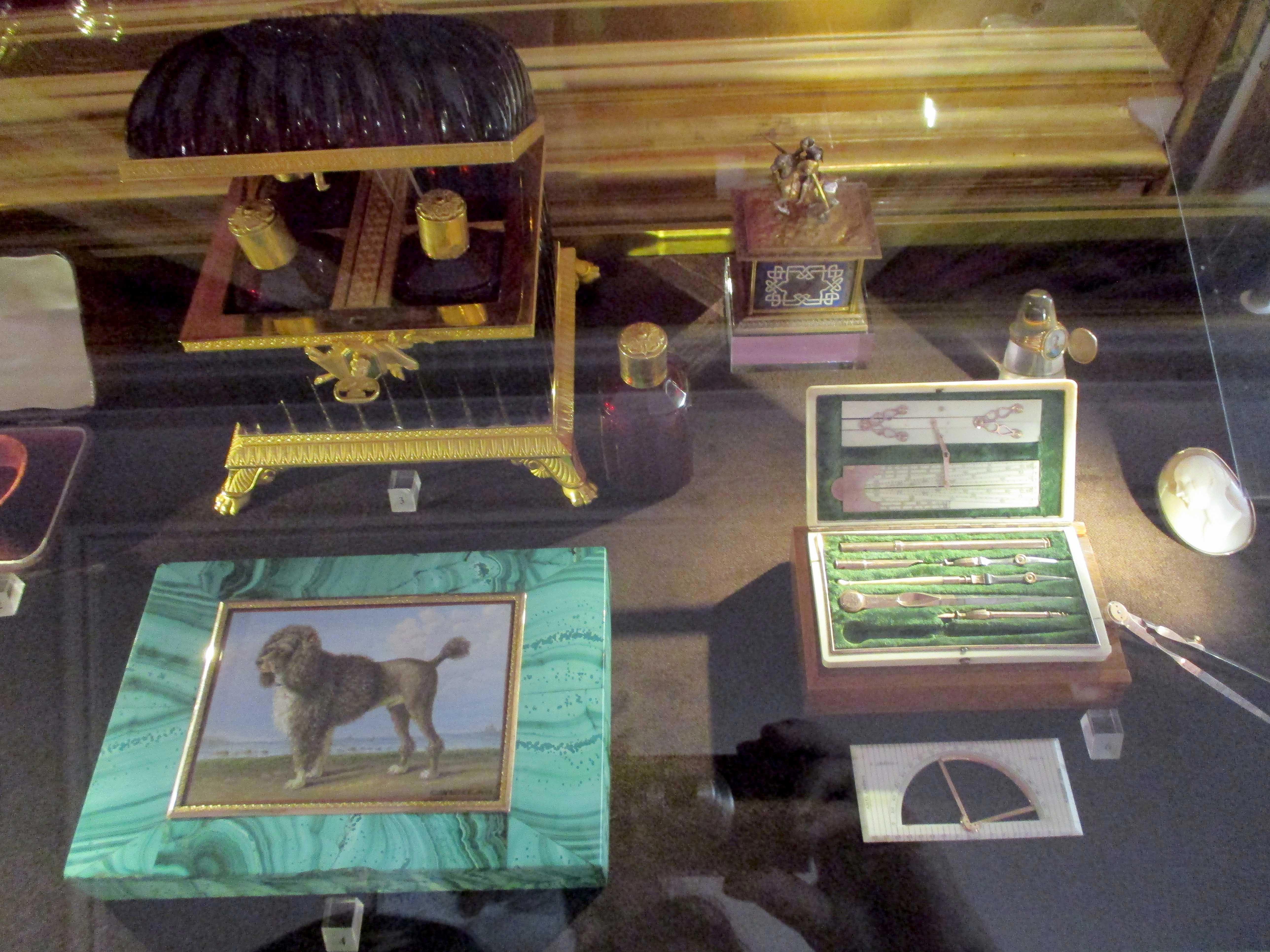 На фото вещи, принадлежавшие Николаю I. Это набор чертежных инструментов, ведь он был военным инженером, печать, изображение любимой собаки - пуделя по кличке Гусар - вставлено в пресс-папье из малахита.