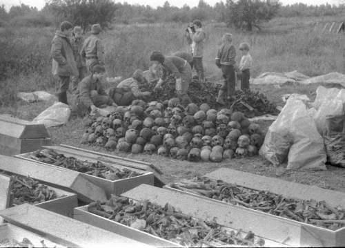 Мясной бор, сбор останков, 90 годы. Привезенные и принесенные из леса костяки раскладываются по гробам.