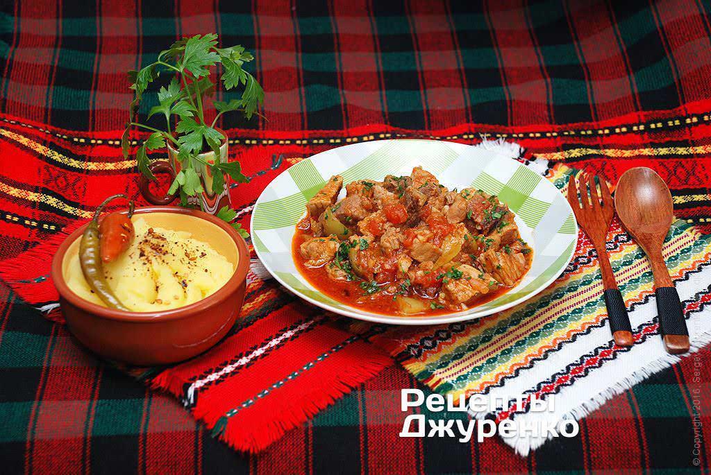 Горячее мясное блюдо разложить в глубокие тарелки, добавить картофельное пюре и маринованный острый перец, или острые соления. Очень неплохо сочетается с предварительно приготовленным перцем в масле и зубчиками жареного чеснока в оболочке.