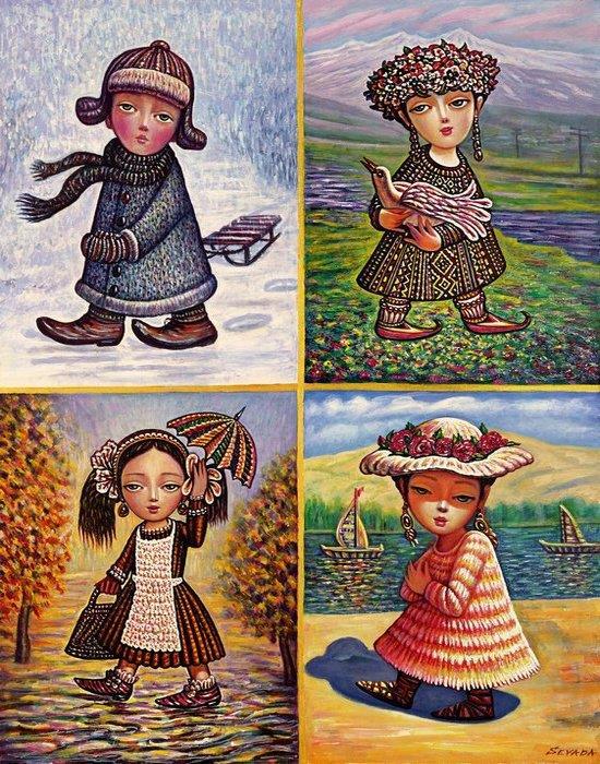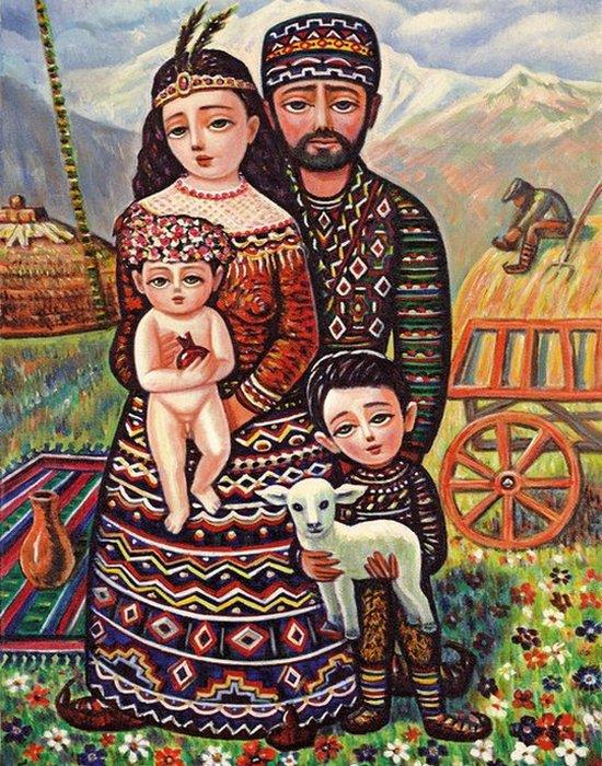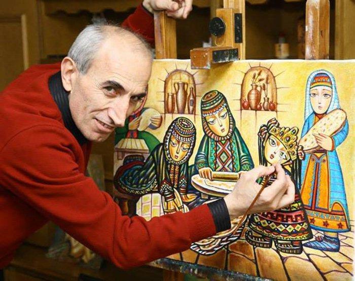 Больше всего в работах художника меня подкупают невероятная теплота и доброта. Мир в них предстает увиденный глазами невинного ребенка и кажется чище, ярче, волшебнее. Центральное место в них занимает тема семьи. А еще в них много армянских фольклорных мотивов, национального уклада.