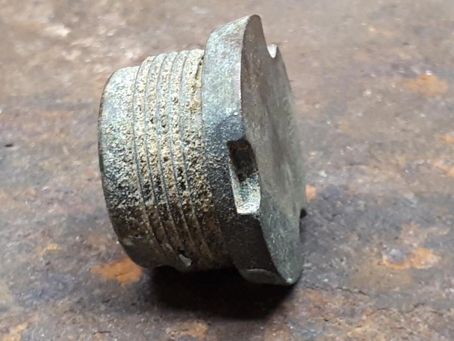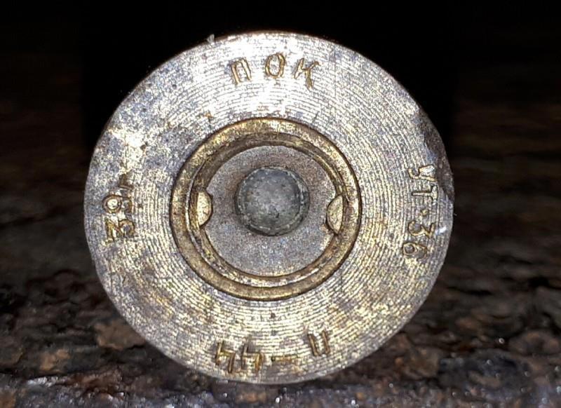 В общем, иду и посвистываю прибором, делая шурфики там, где трели прибора особенно приятны. В одном из распадков попался сигнал нечастый. Похоже на латунный винтовочный отстрел, но немного не такой – цифры бьют выше. Подумал, может авиация чего-то насыпала – сигнал похож на отстрел пушки ШВАК. Копнул. Выскочили две такие штуки. Дома их помыл и рассмотрел.
