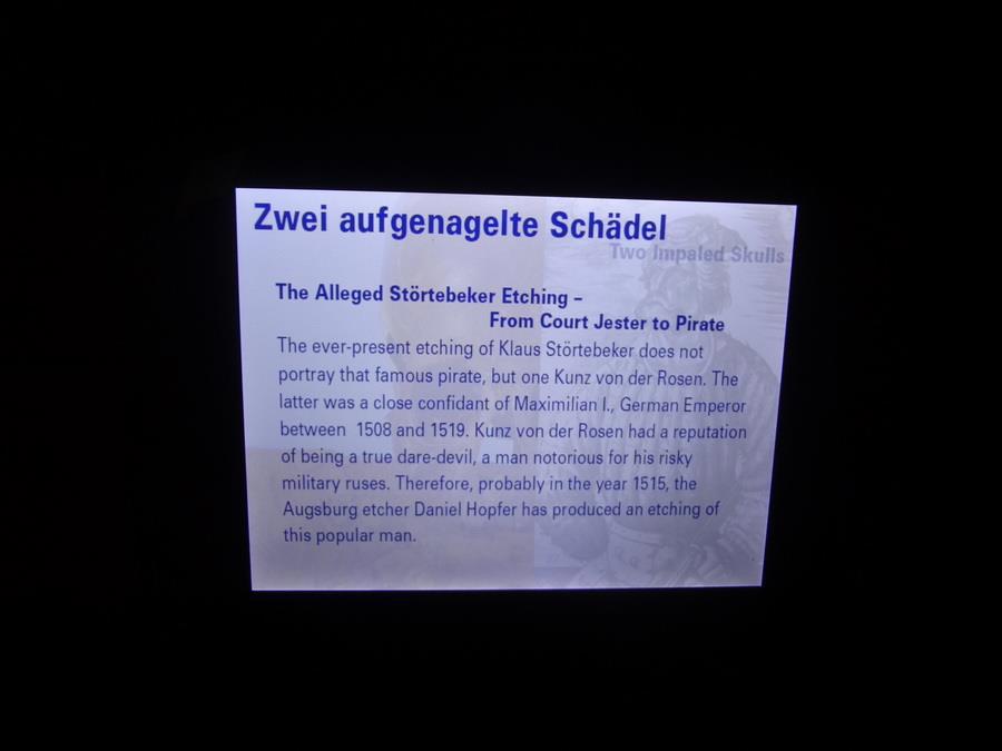Есть в музее - рядом с подлинным черепом (правда не факт, что именно Штёртебеккера))) - и восковой портрет по старинной гравюре. Ну как положено у историков - многие считают, что это портрет не пирата, а приближенного императора Максимилиана - тоже штукарь был, но помер с головой на плечах.