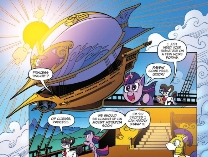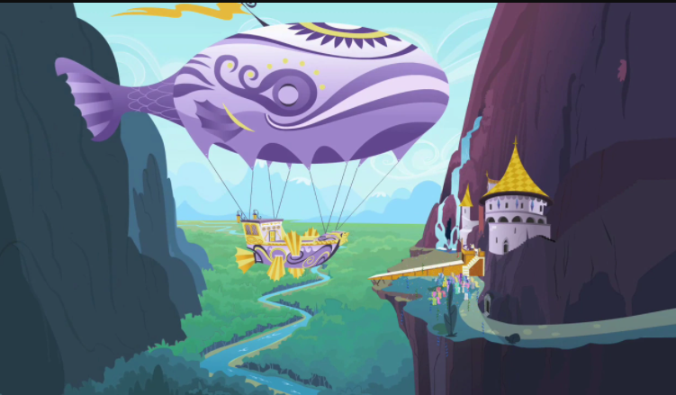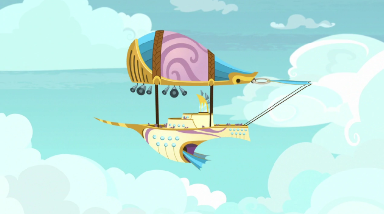 А вот самым красивым кораблём является королевский дирижабль, появившийся только в комиксах. Громадный, внушительный, величественный, он является вершиной воздушного кораблестроения Эквестрии, а его размеры настолько огромны, что он больше напоминает город. Символ на его баллоне - слитые кьютимарки (метки на крупе) Селестии и Луны, правительниц Эквестрии.