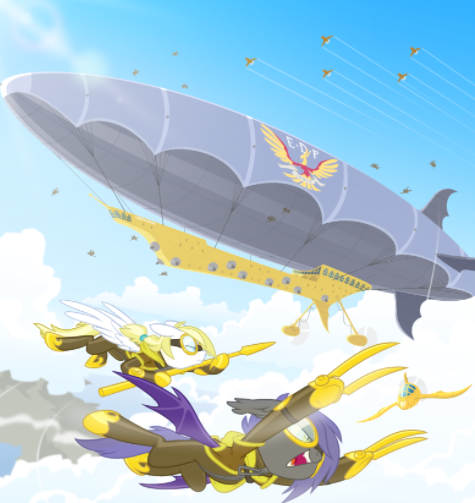Через двести лет после Великой Войны металлические летающие монстры, опирающиеся на дикую мощь штормов и ураганов, вгоняли в ужас всё население Эквестрии. Окружённые пегасами чудовища сбрасывали бомбы на города и утюжили из орудий исстрадавшуюся землю... Но это - всего лишь фантазия Ккат, одна из множеств. В этом посте я кратко познакомлю вас с летающими кораблями Эквестрии, приведёнными в каноне и полу-каноне.