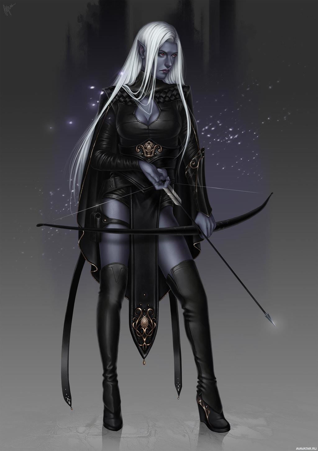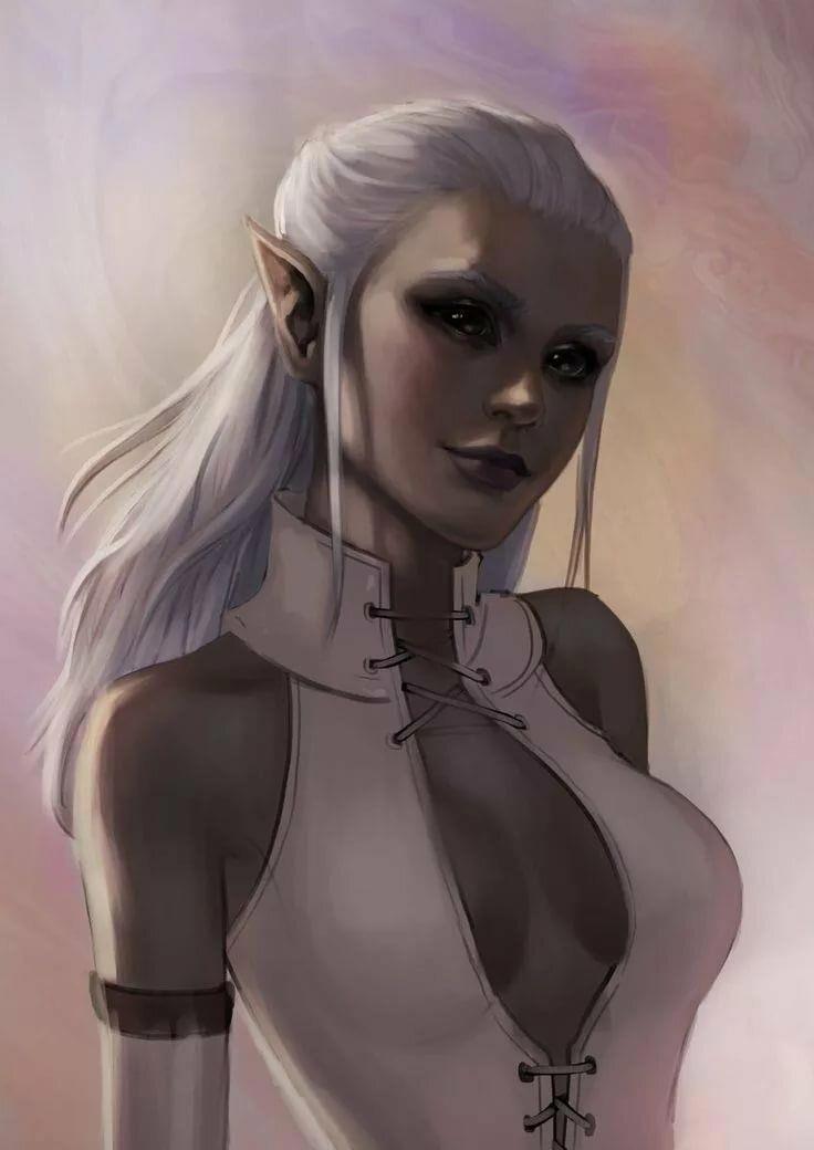 И естественный отбор привел к классическому Дроу. Темнокожий эльф с глазами с крупным зрачком  (почти без белков). Возможно белый цвет волос Дроу - это эхо социальных отношений. Где стандартом красоты являлся цвет волос, и темноволосые отвергались от процесса размножения.
