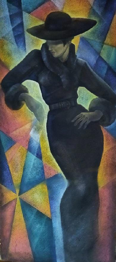 Эта картина  нарисована цветными мелками в 90-х годах моей подругой Ираидой Орловой. На ней изображена кривляка в горделивой позе, этакая юная Ахматова,  высокомерно позирующая в лучах рампы. Я часто вынимаю  полотно из-за шкафа и внимательно оглядываю.  Позу, движения рук, выражение лица.  Чего-то стыжусь,  на что-то злюсь, и только по талии откровенно ностальгирую.  Да-да. Это я сама в двадцать пять лет...