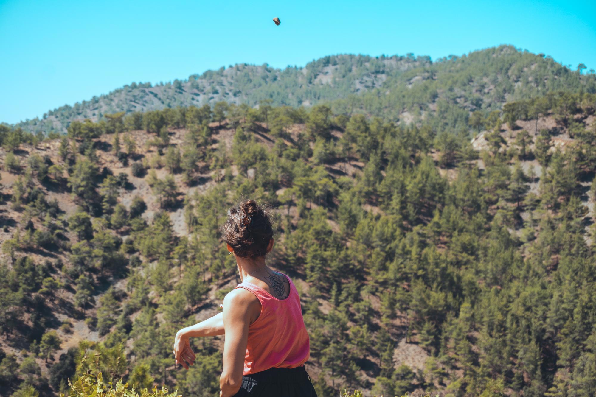А на фото, конечно, совершенно другой случай. Место очень удачное — вертолетная площадка на скале посреди горного леса. Можно брать камни, шишки, и метать их без ограничений в любую сторону.