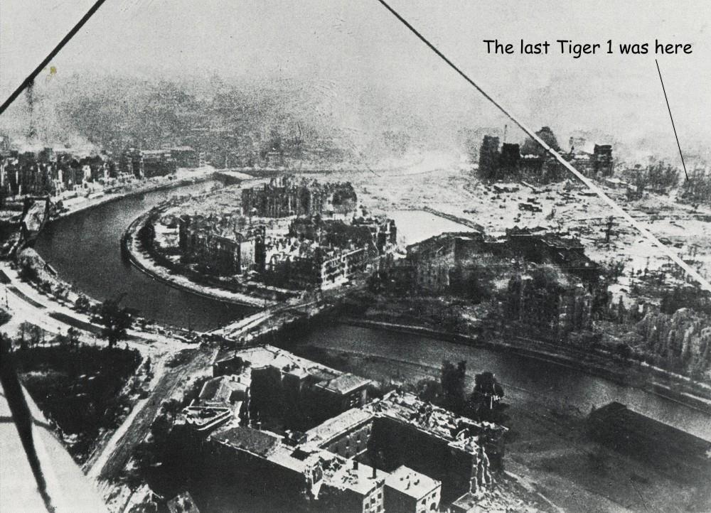 На фото видно, что он расположен весьма важно - на краю фото как раз виден Рейхстаг. Танколюбы отметили место, где встал последний Тигр. Тоже к слову известное фото.