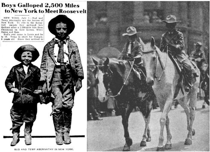 "В 1910 году братья Луи и Темпл Эбернети пересекли Америку верхом от Оклахомы до Манхэттена. Без присмотра взрослых. Было им тогда 10 и 6 лет. А чтобы вернуться, они отправили своих лошадей поездом, а сами купили машину (небольшой Brush Motor Car), сели за руль и поехали домой.