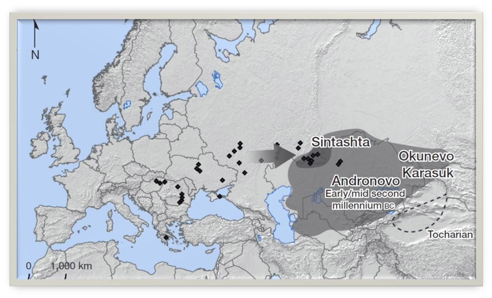Читаю дальше: «В лженаучной продукции об Аркаиме можно выделить … Во-первых, это постулирование славянского этнического происхождения «синташтинцев».» Ну, так, а что здесь удивительного-то? Если историческая наука всегда и везде пытается доказать нам, славянам, что мы возникли прям сегодня, с утра, но в лучшем случае вчера вечером, то поневоле у людей возникают вопросы о том, а как возникли? Ах, пришли и заселились... откуда пришли-то? И увидев в украшениях «Синтакши» знакомые до боли мотивы, люди вполне естественно узнают в них «своих». Так нет же. Г-н профессор гневно отвергает подобные «лженаучные» предположения: «Большинство исследователей относит синташтинское население к индоиранской ветви индоевропейской семьи языков.» И далее следует длинное и маловразумительное повествование, состоящее из терминов типа «глоттохронология». Позвольте... лингвистика? А что, разве на территории хотя бы одного из памятников «Синташты» найдено хоть что-то с буквами? Или хоть один из полусгнивших костяков вдруг перекинулся парой фраз с г-ном профессором? Чего здесь вообще делает лингвистика? В общем единственный вопрос, который не даёт спать профессору, это: «...являлись ли «синташтинцы» индоиранцами или уже иранцами...». Ещё один прямо «убойный» аргумент, приведённый профессором: «Также представителями различных научных направлений при изучении синташтинской проблемы нередко задействуются тексты Ригведы и Авесты.» Во как... славян ещё не было совсем, даже предков их не было, а Иран уже был и располагался он, стало быть, на Среднерусской возвышенности и далее на юг до Каспия и Чёрного моря. Ведь так получается, если учесть, что «синташтинцы» по словам г-на профессора на южный Урал именно оттуда переселились. Даже красивую картинку из иностранного журнала приводит со стрелками (прям полководец):