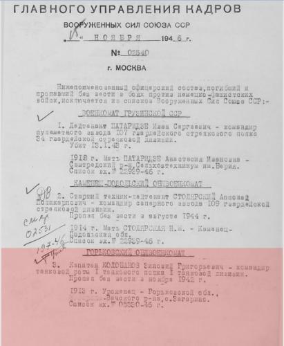 Кому не видно со смартфона, в документе Главного Управления Кадров ВС СССР от 15 ноября 1946 года говорится о том, что капитан Колобанов Зиновий Григорьевич, командир танковой роты 1-го танкового полка, 1-ой танковой дивизии, пропал без вести в ноябре 1942 года и это уже не фантдоп.