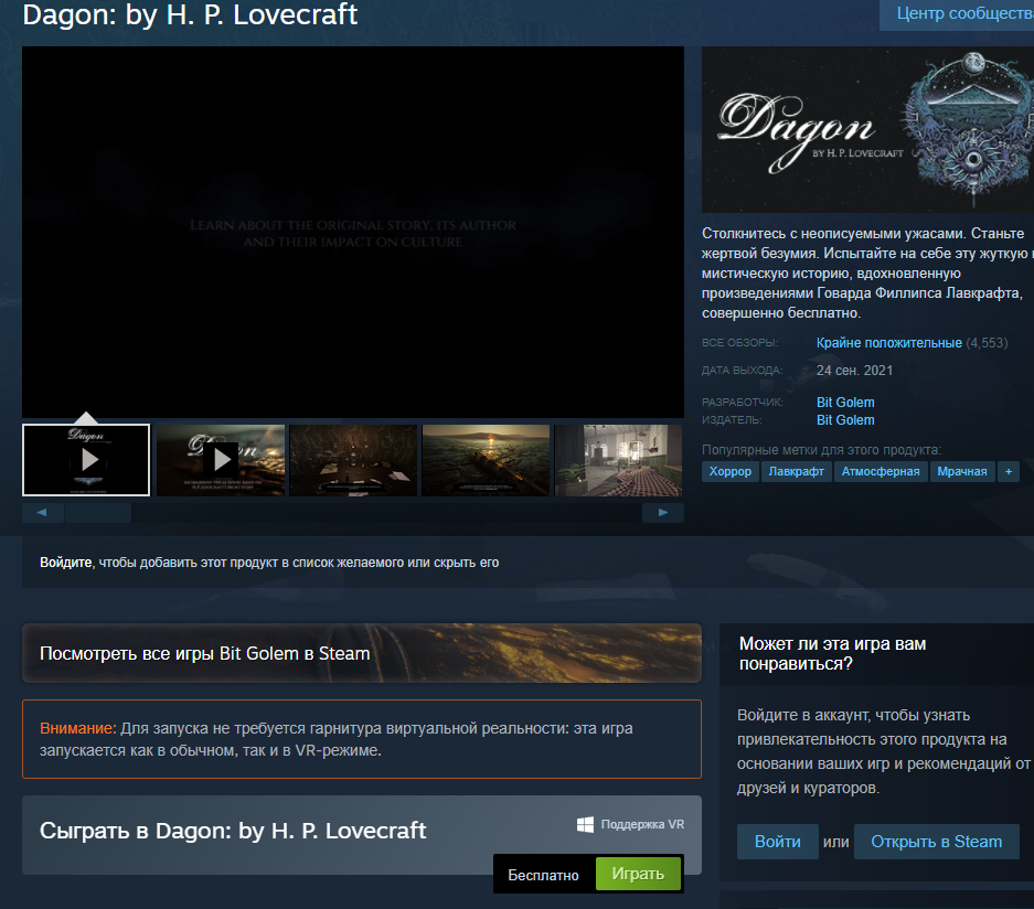 В Stem совершенно бесплатно для всех пользователей можно поиграть в рассказ, точнее в игру по рассказу "Дагон" Говарда Филлипса Лавкрфата. Наткнулся на игру-рассказ совершенно случайно и не остался равнодушным.