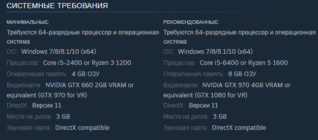 Думаю, требования для такой игры завышены, и главным образом из-за того, что игру можно запускать в VR-режиме. Жаль, что у меня нет VR-очков (далеко не каждому по карману), правда, у меня и компьютер не потянет такую нагрузку, слишком старенький.