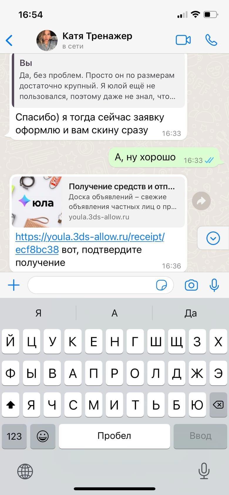 Но на этом я не остановился, и подумал - а ведь частенько мерцает реклама про некую "Юлу". Думаю - надо попробовать все рычаги. А через месяц, если уж совсем припрет - буду шариться по ВК-барахолкам Перми. В итоге, зарегистрировался на Юле, скопировал объявление и благополучно решил забыть на ближайший месяц. Однако, не прошло и трех часов, как мне на Ватсап пишет восхитительная фитоняша (судя по аватарке) Екатерина и начинает интересоваться про тренажёр.